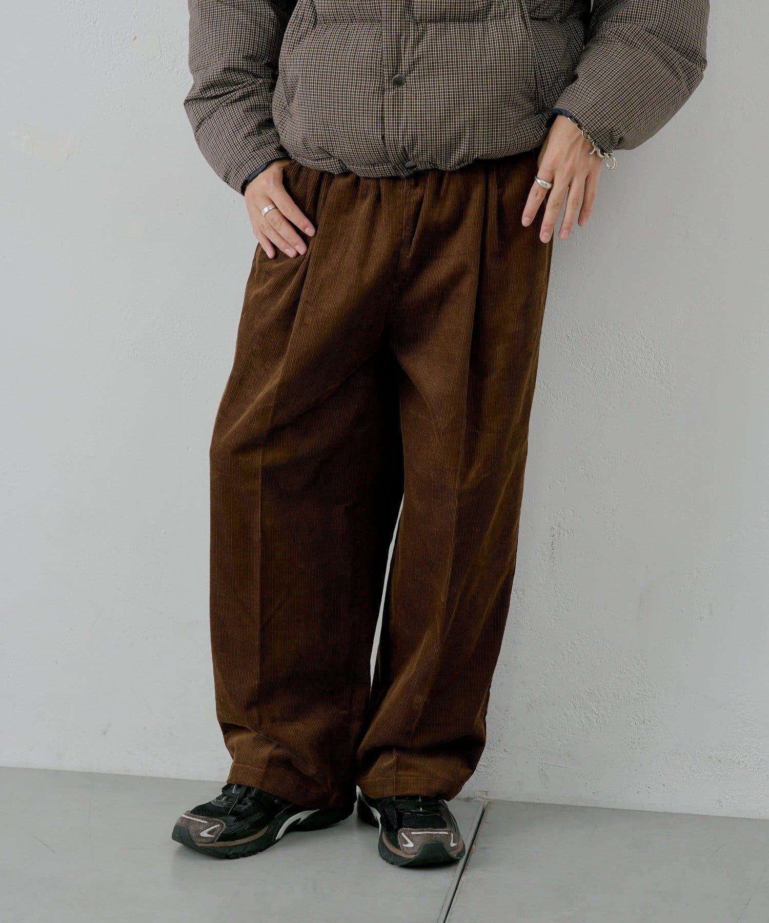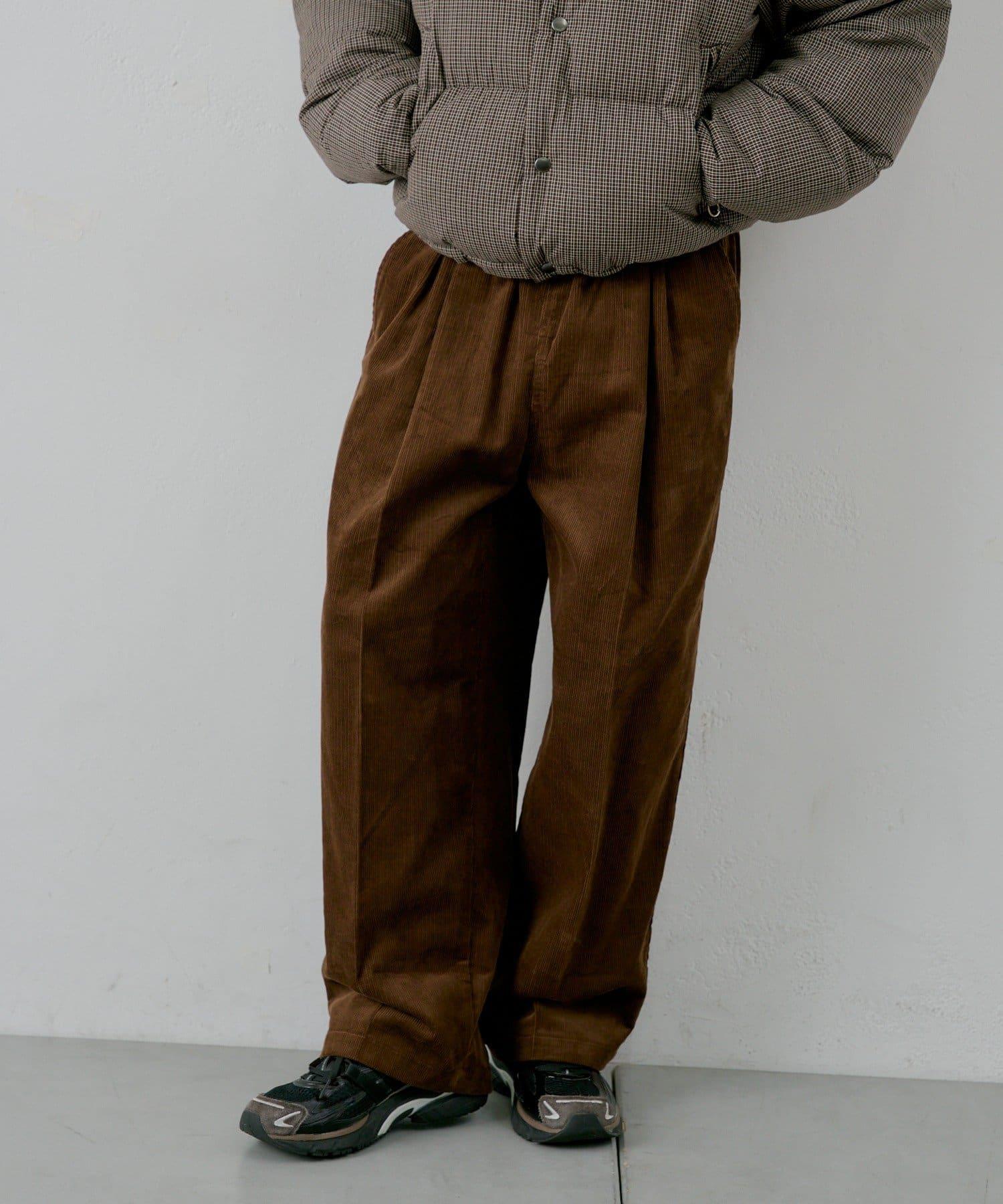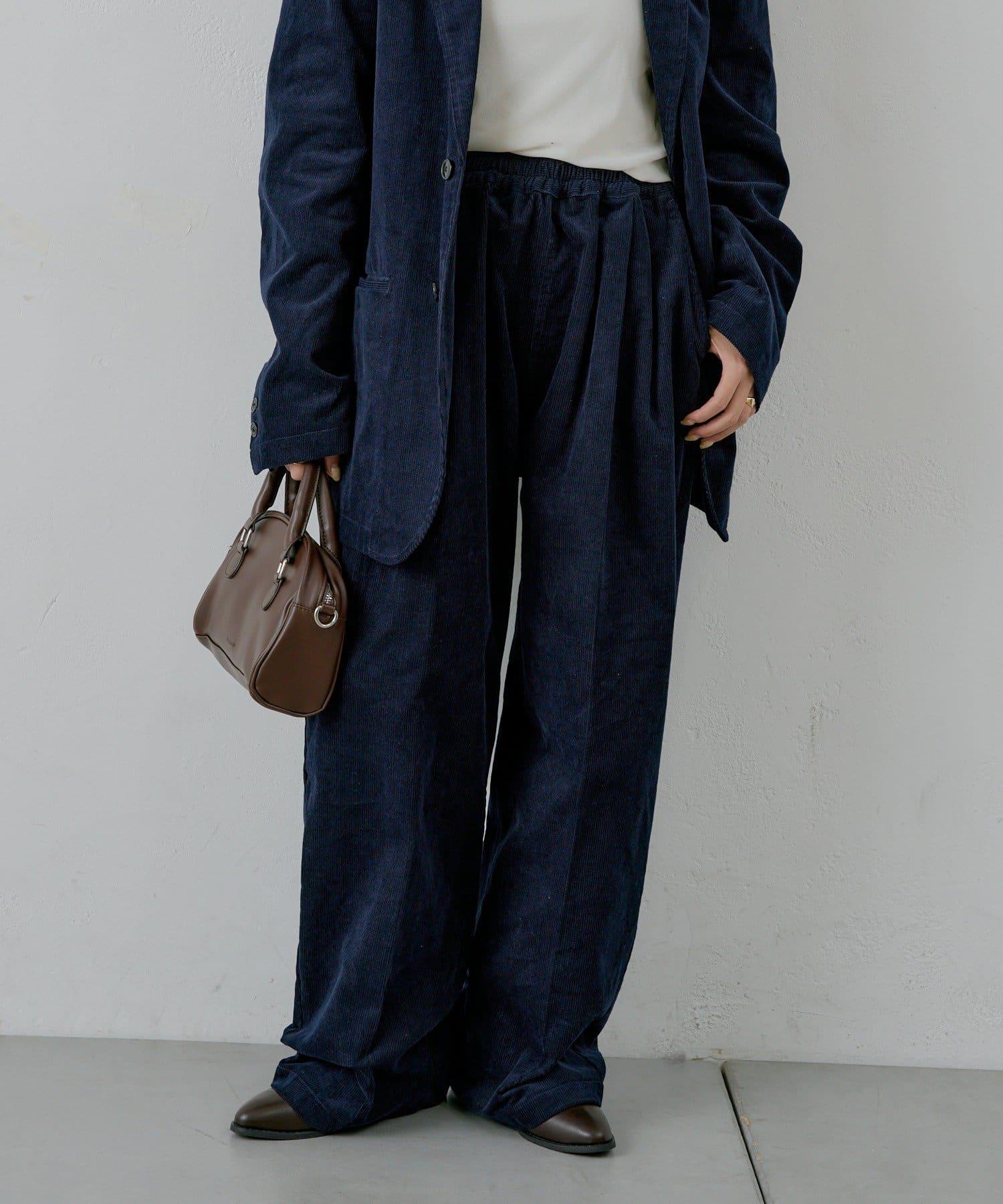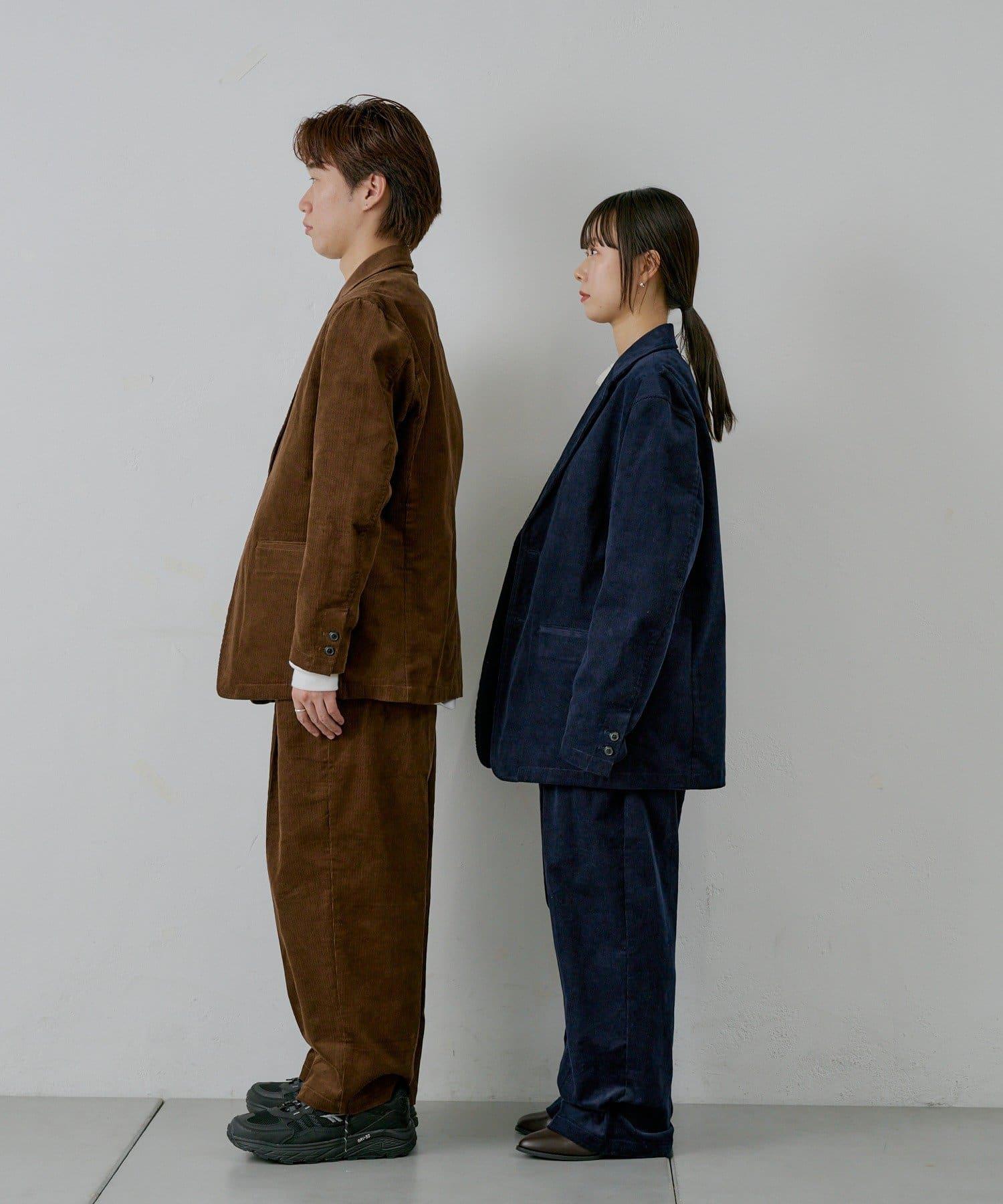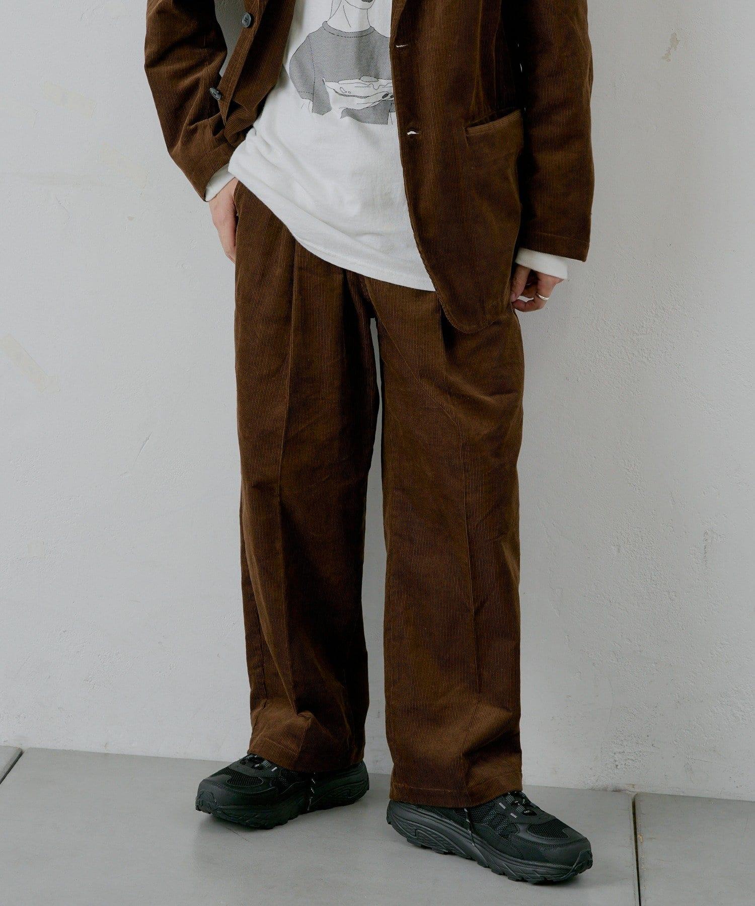 中性寬燈芯絨長褲,顏色深沉,質地柔軟。