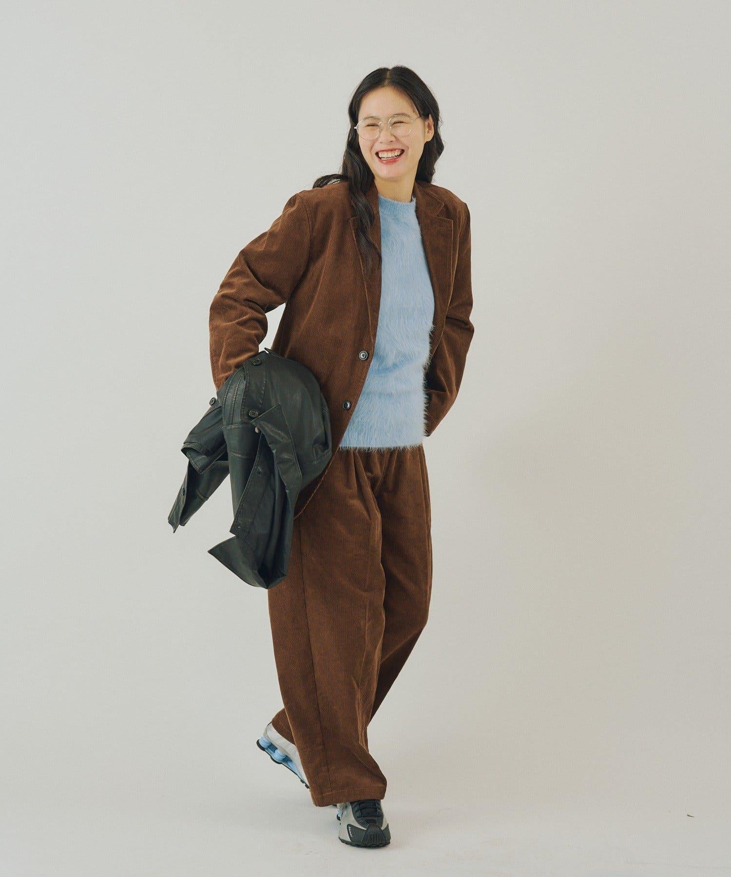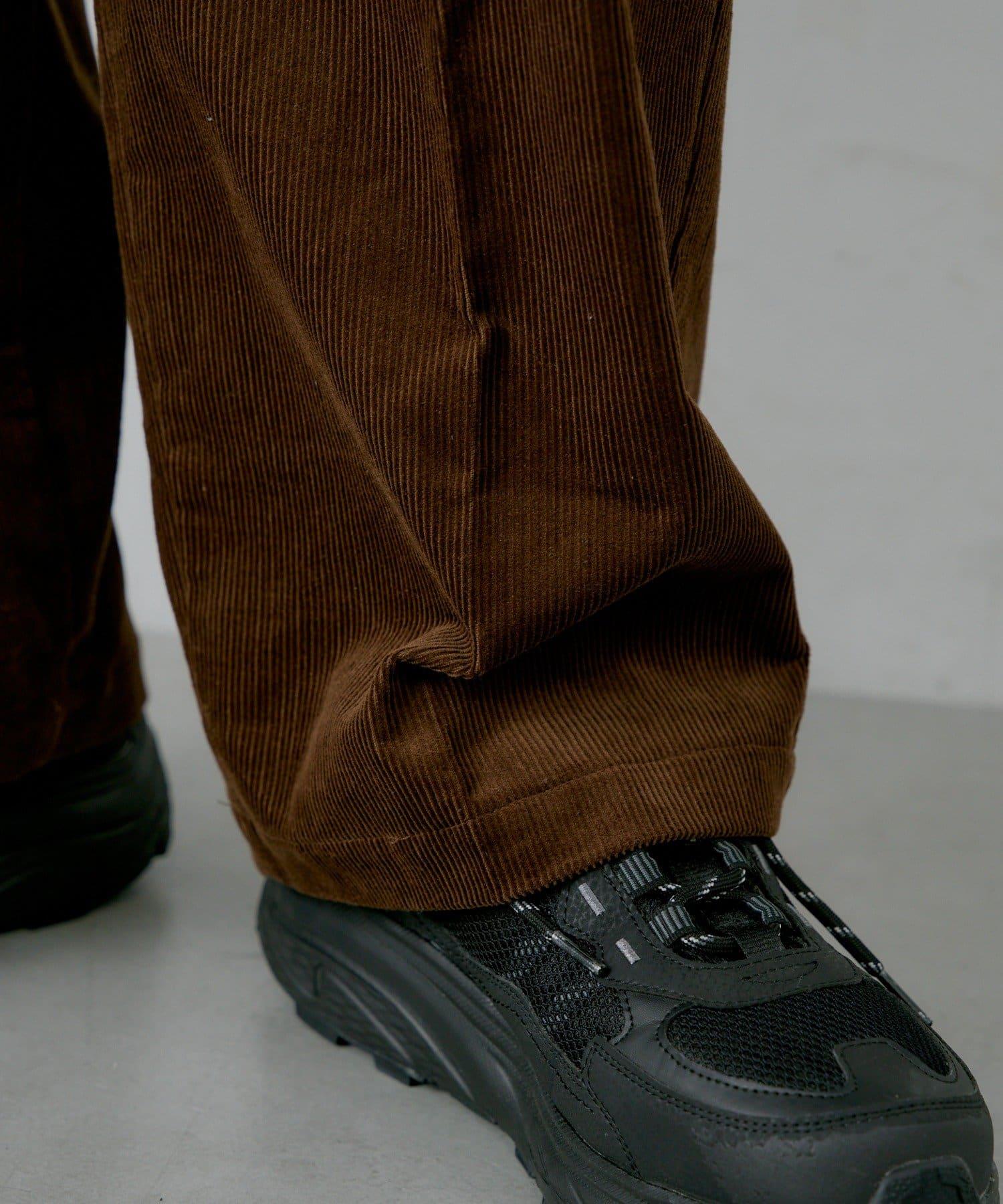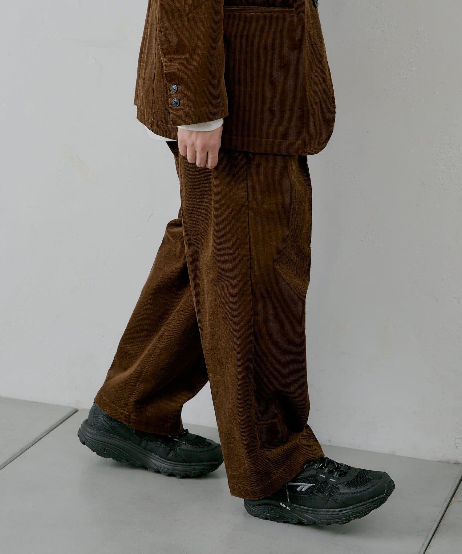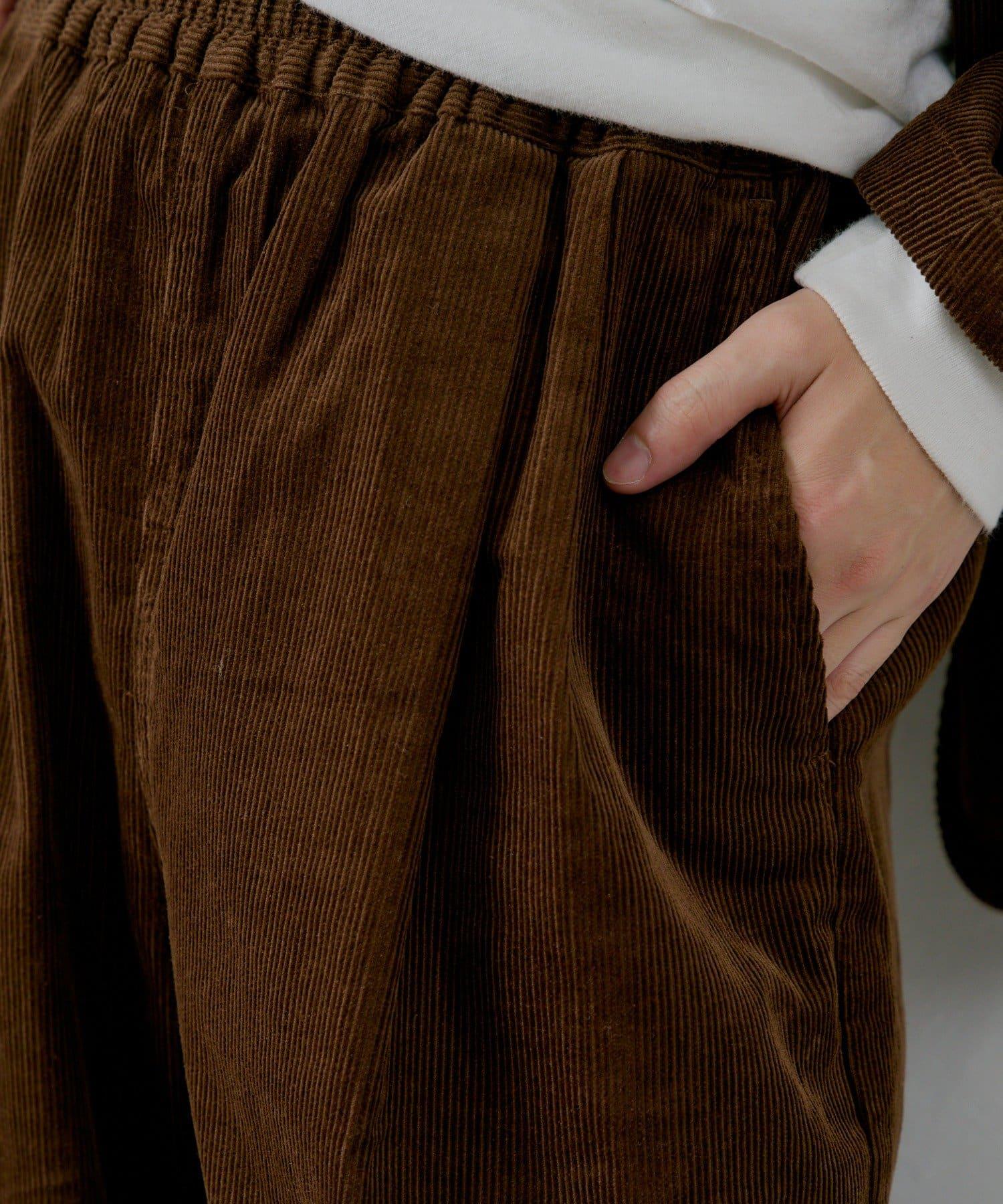 這款長褲採用粗稜燈芯絨面料製成,具有很強的存在感,光澤度適中,很有季節感。