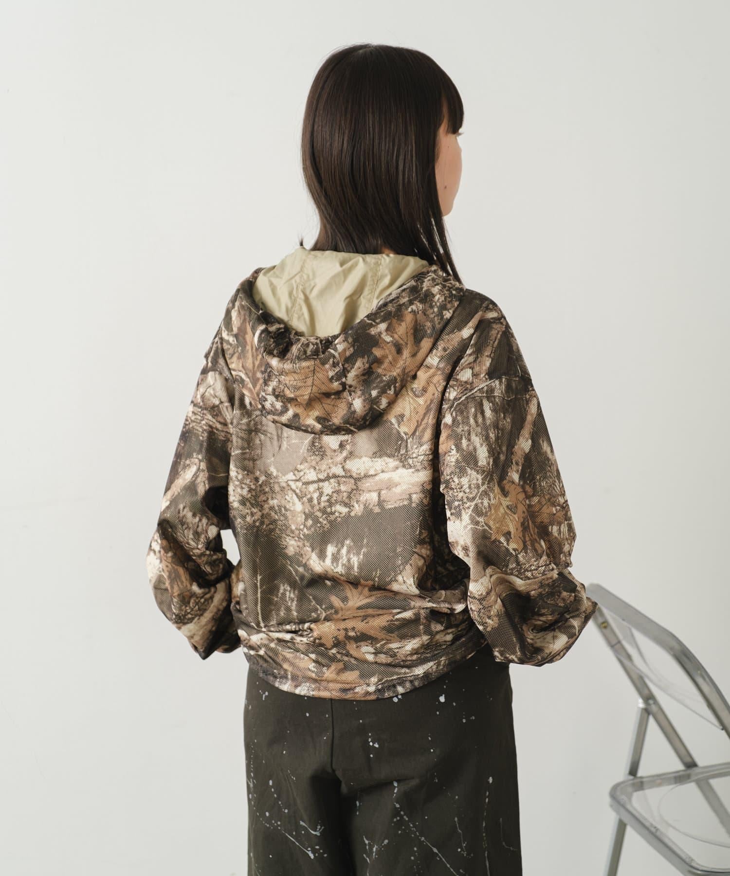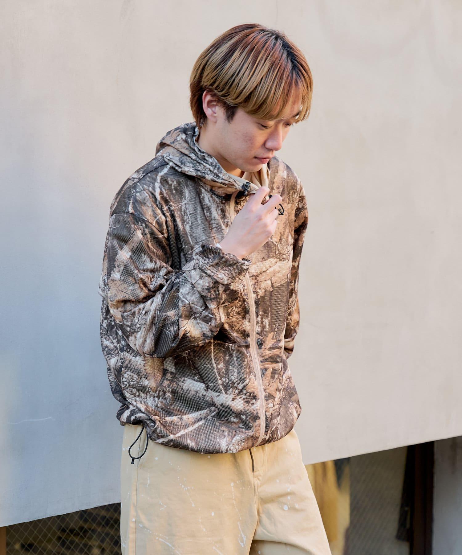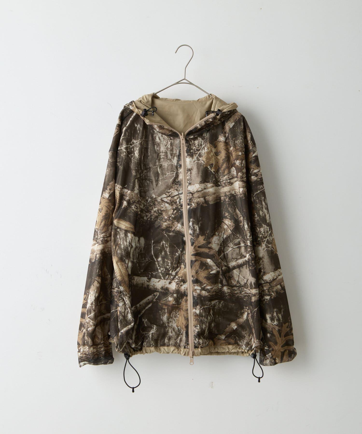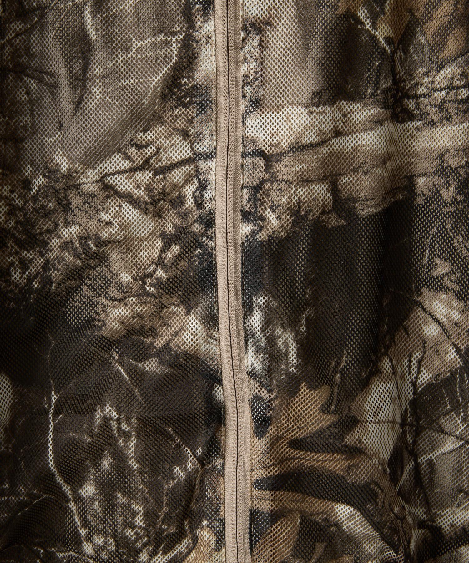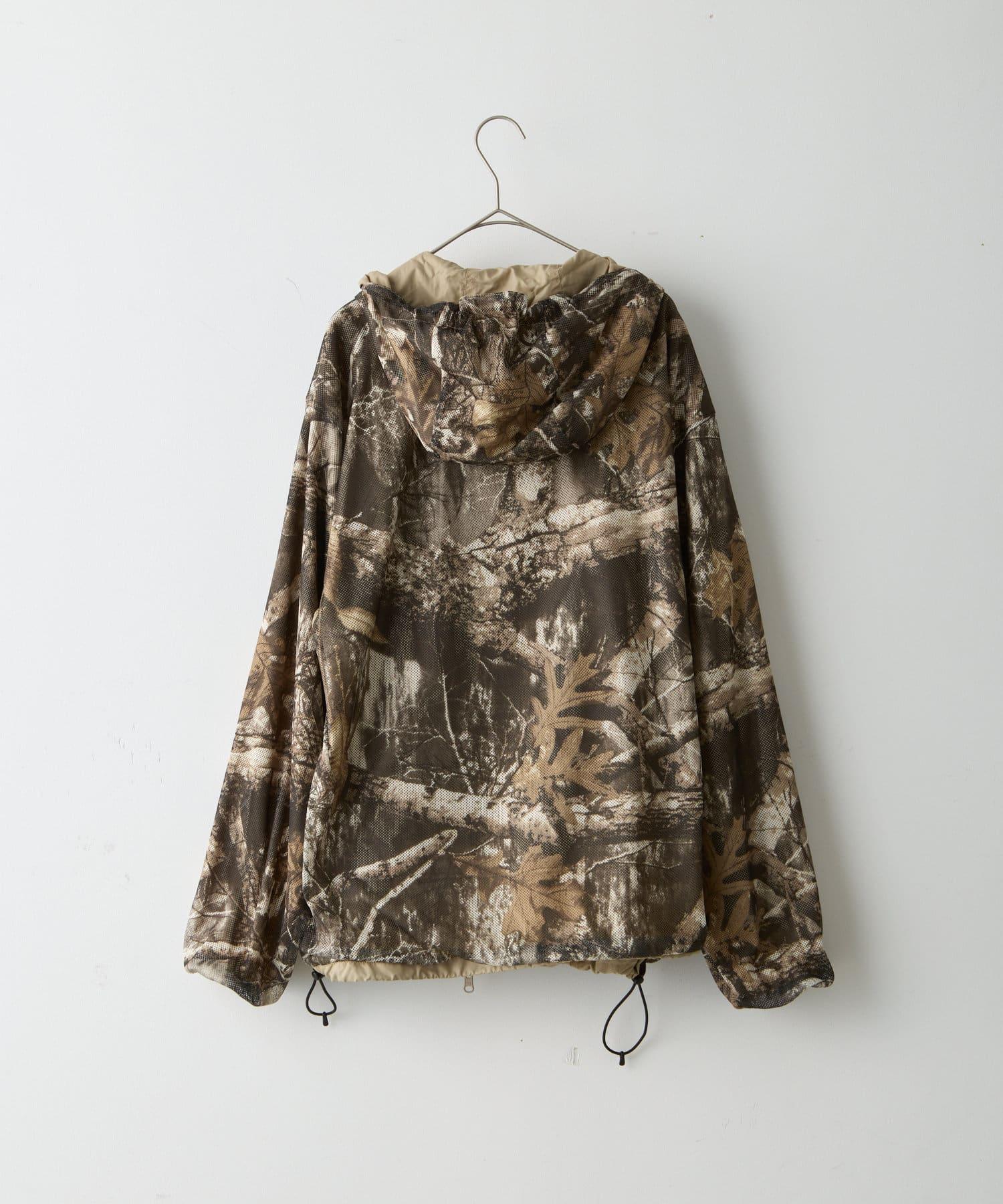 這是一款網眼/尼龍雙面拉鍊連帽衫,其配色和迷彩圖案具有 90 年代戶外和狩獵用品的感覺。