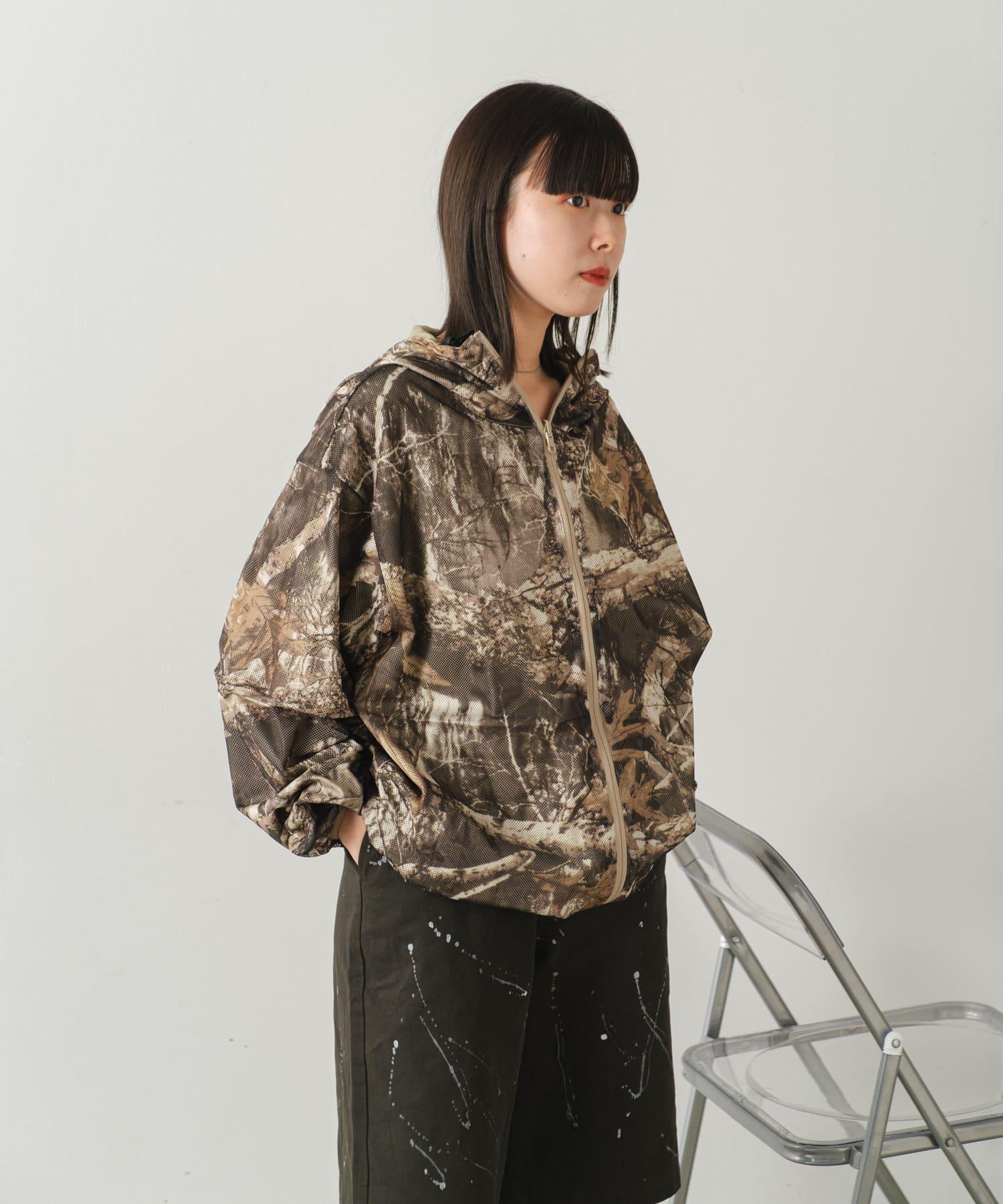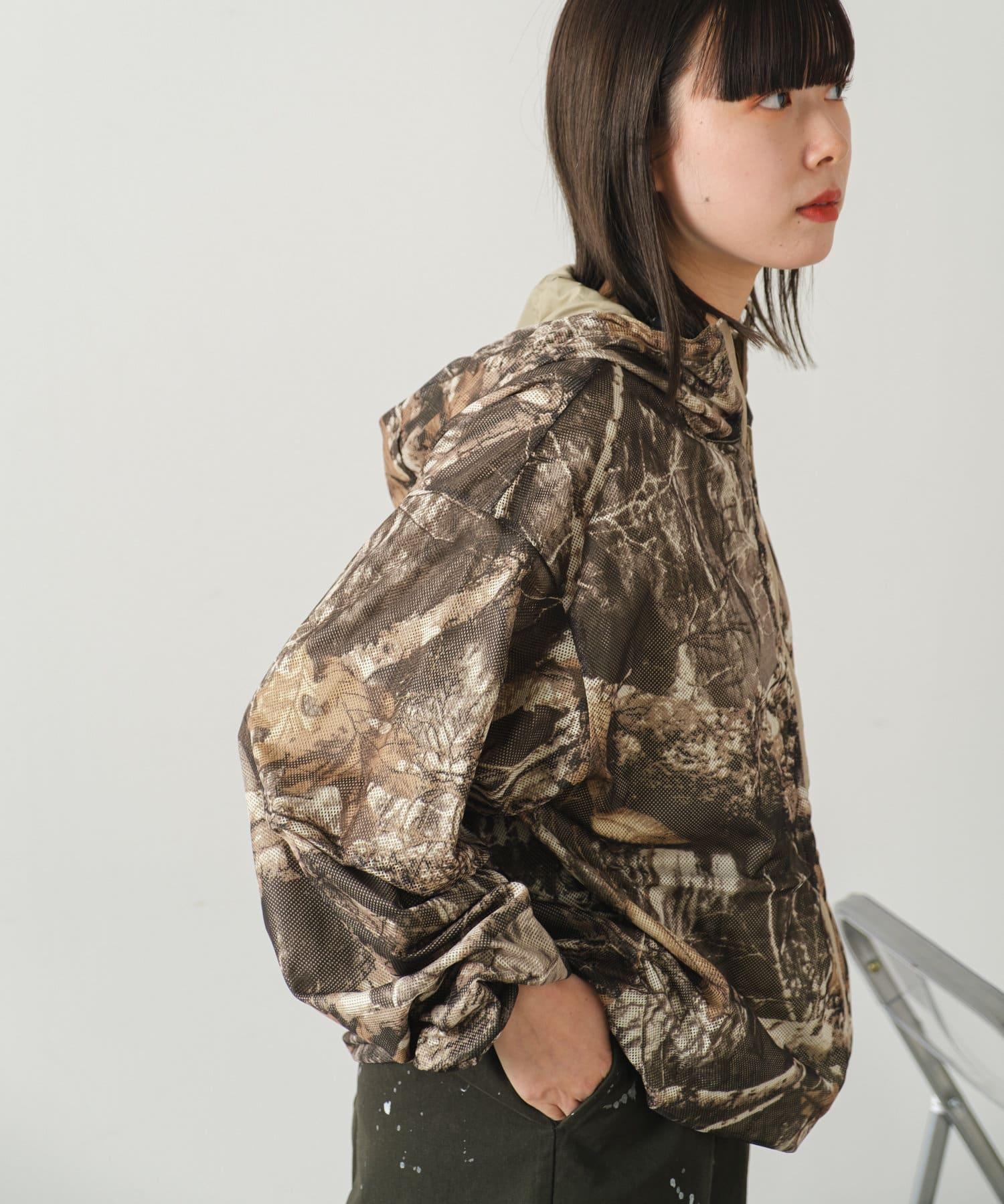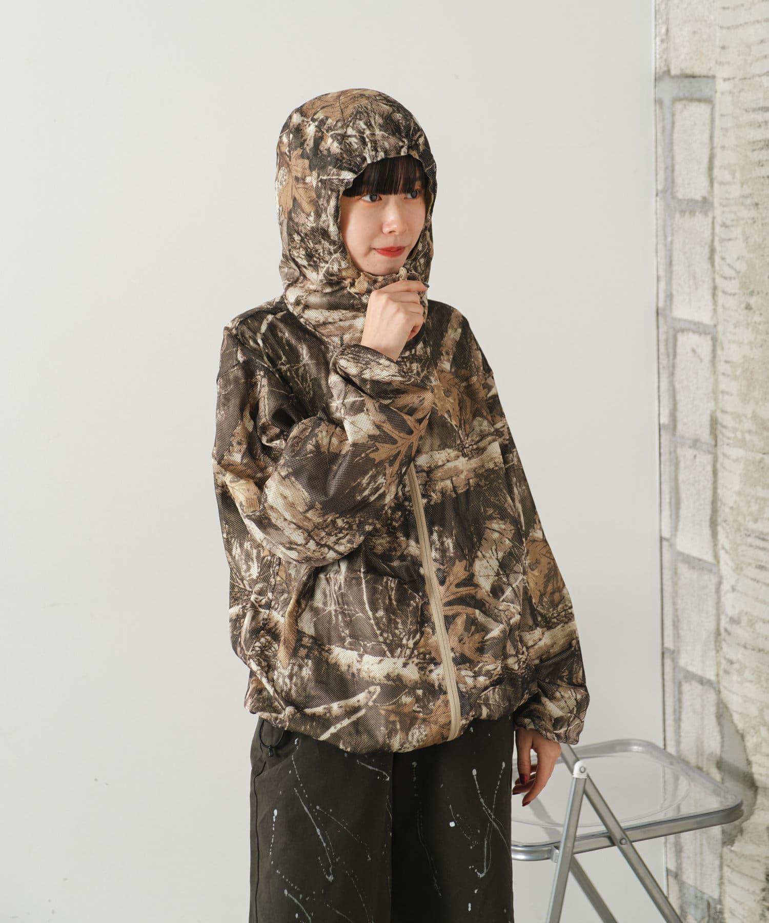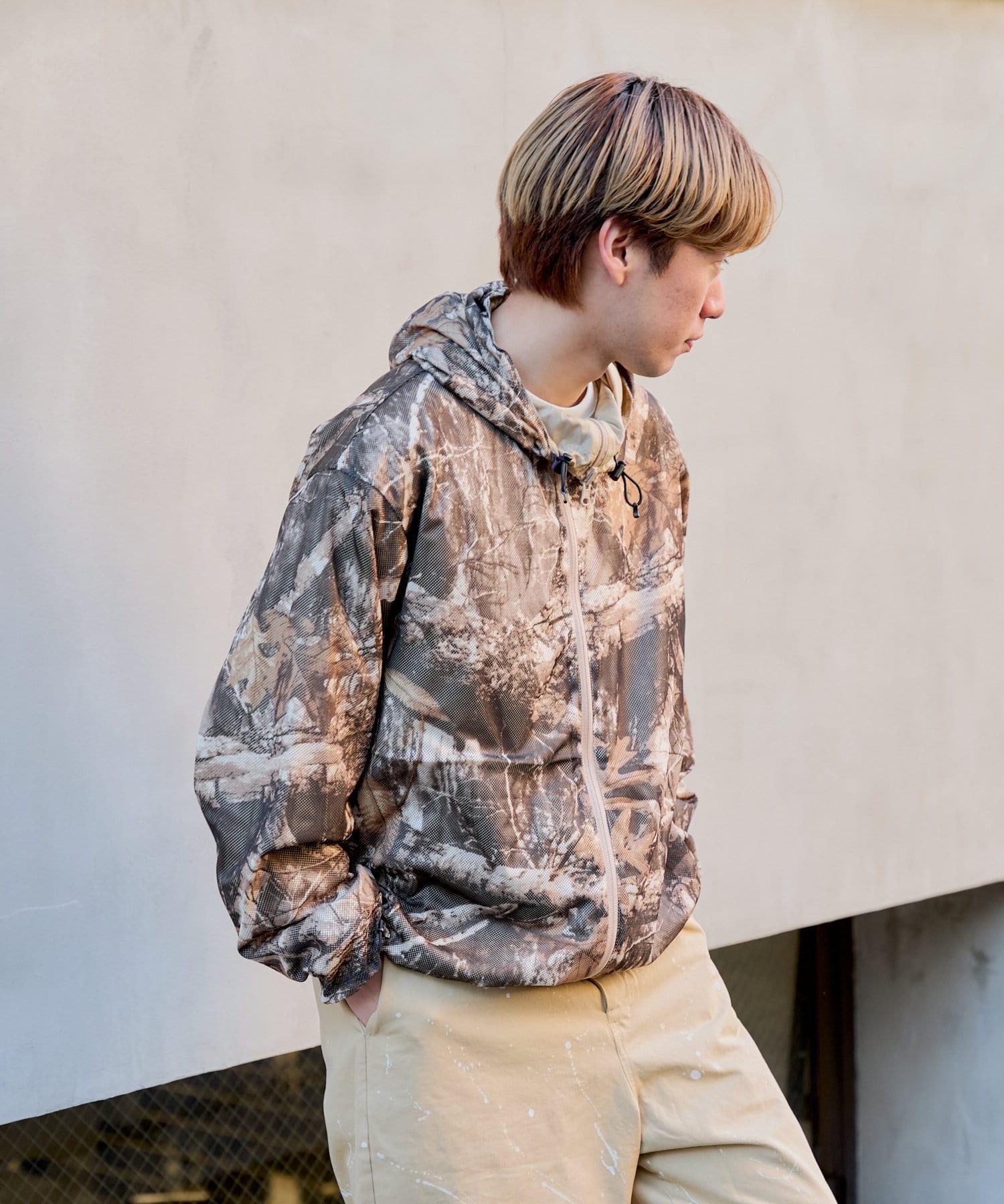 這是一款網眼/尼龍雙面拉鍊連帽衫,其配色和迷彩圖案具有 90 年代戶外和狩獵用品的感覺。