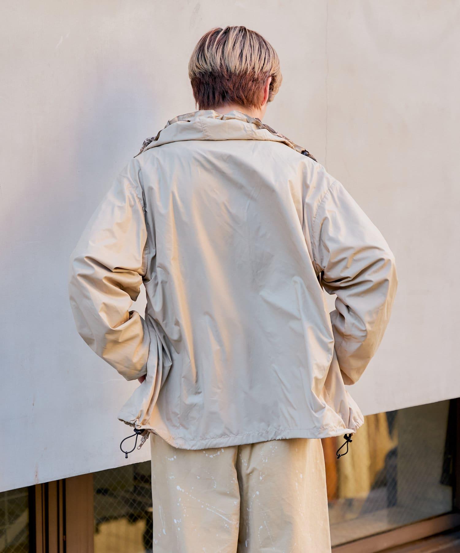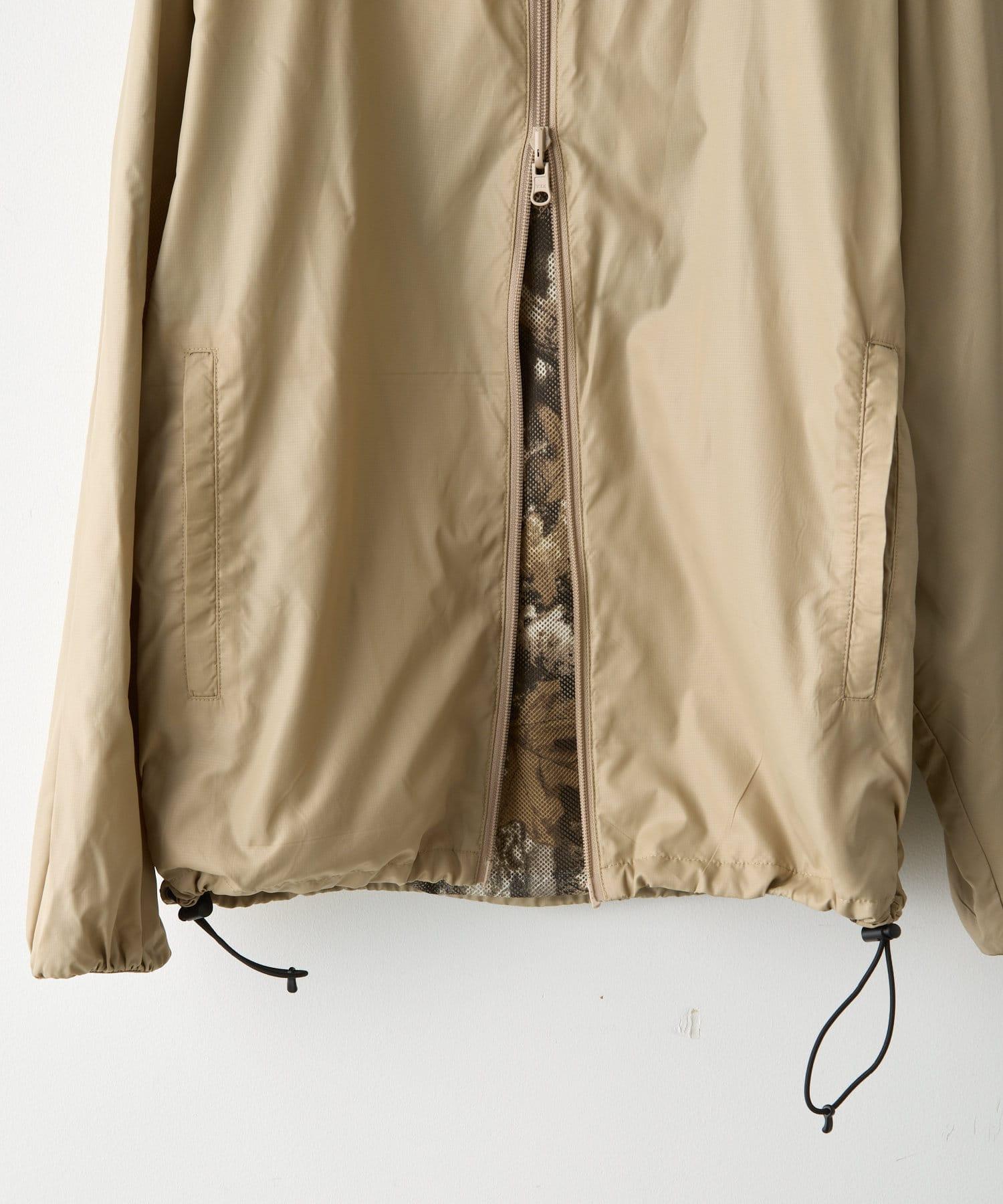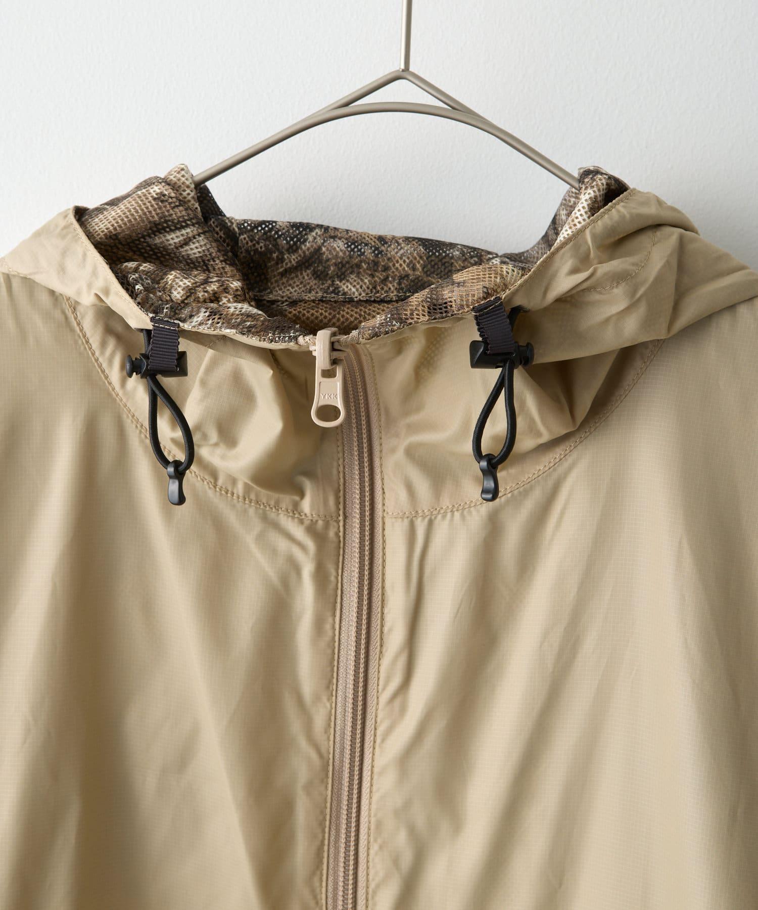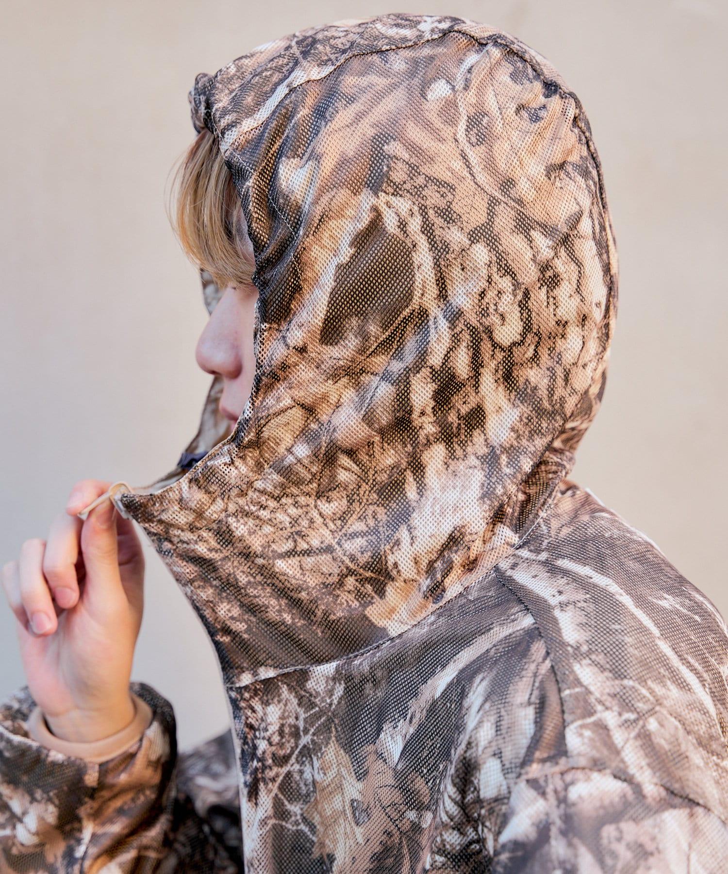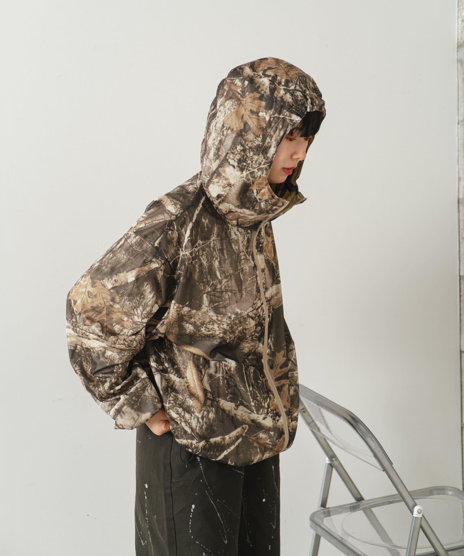這是一款網眼/尼龍雙面拉鍊連帽衫,其配色和迷彩圖案具有 90 年代戶外和狩獵用品的感覺。