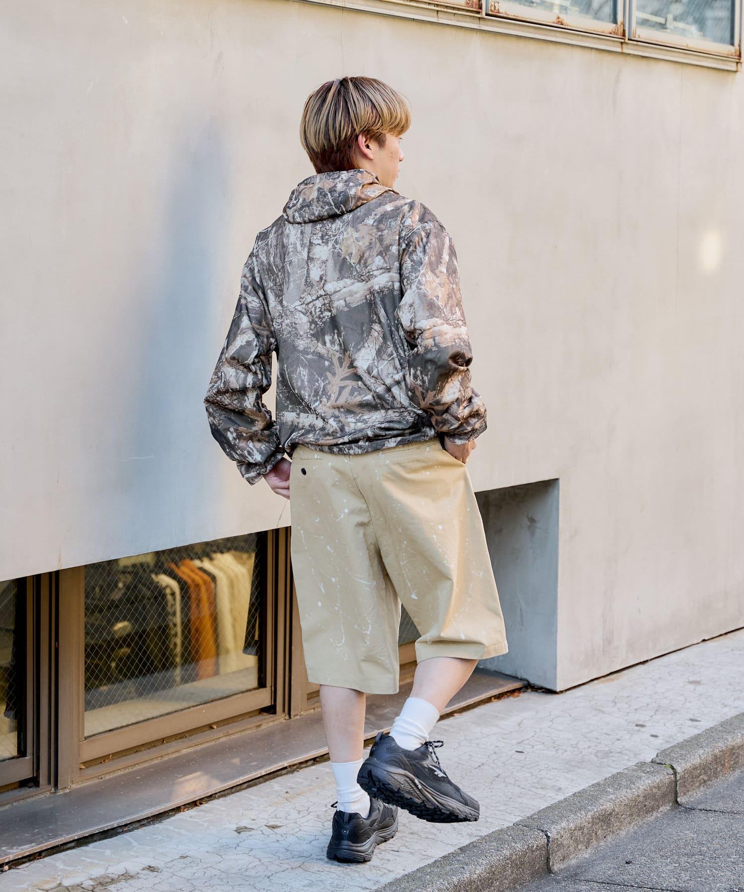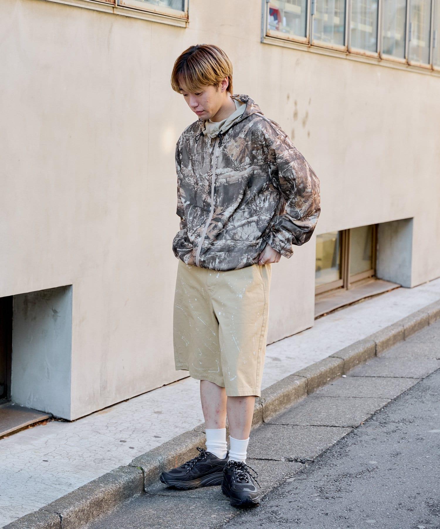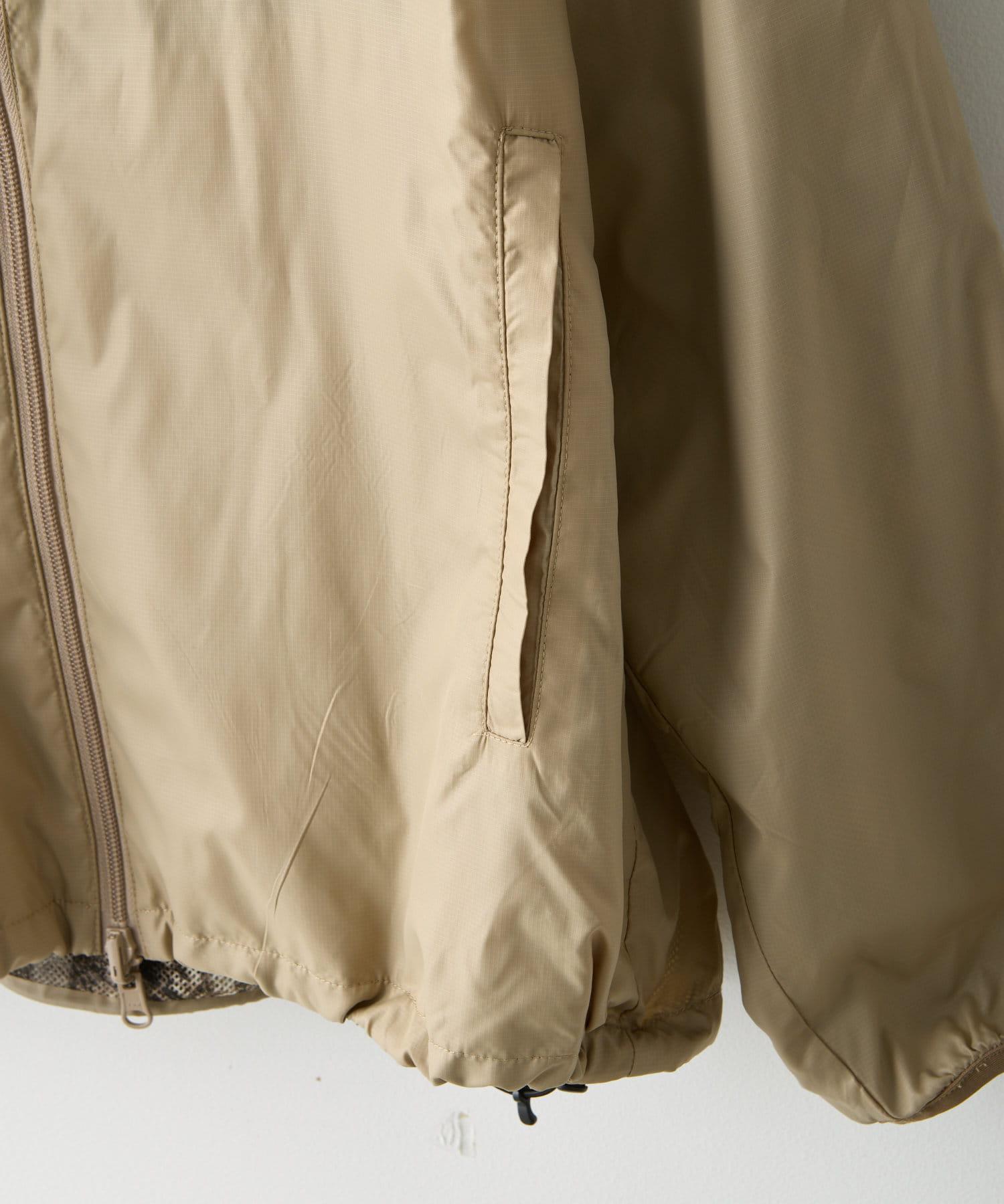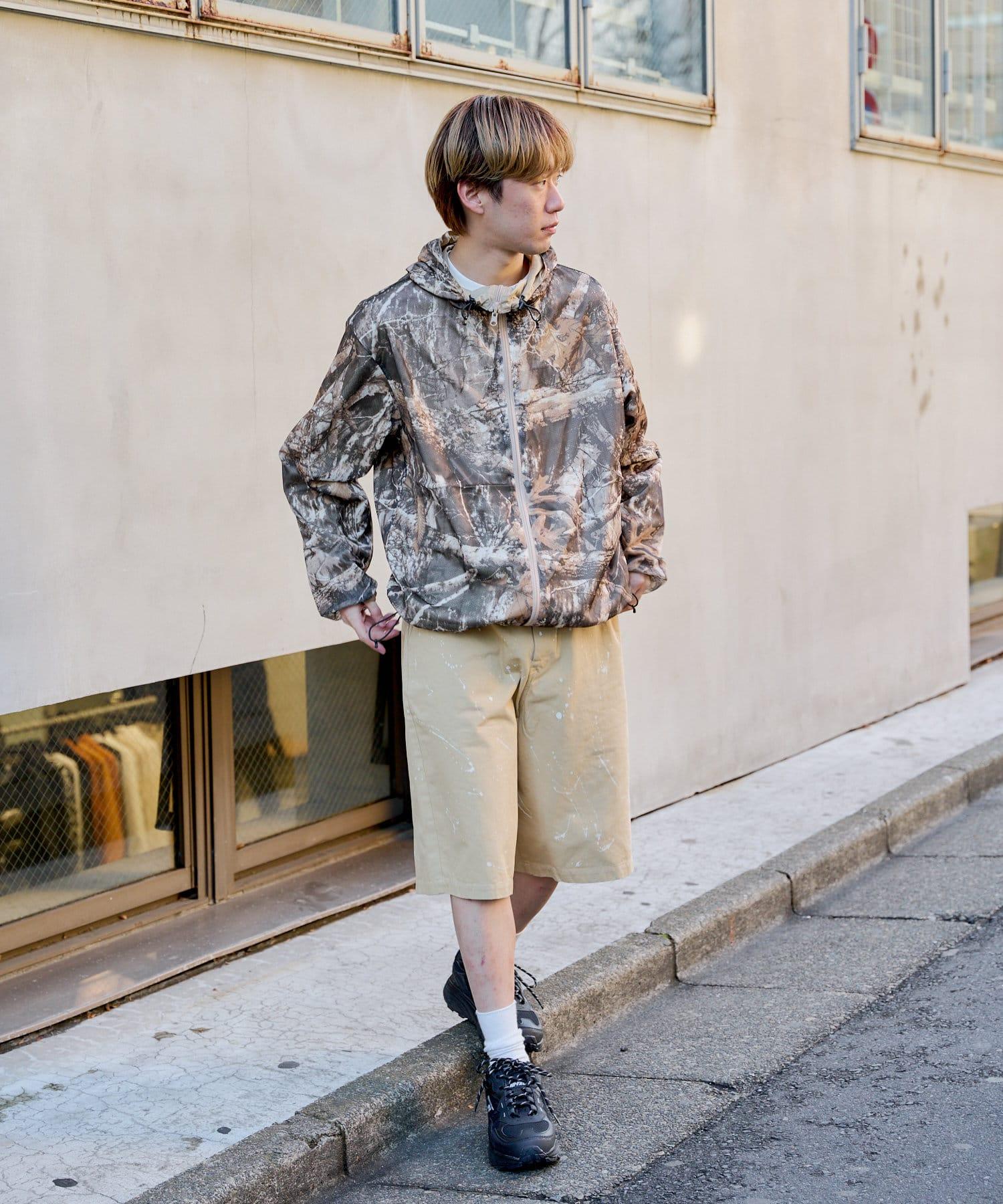 這是一款網眼/尼龍雙面拉鍊連帽衫,其配色和迷彩圖案具有 90 年代戶外和狩獵用品的感覺。