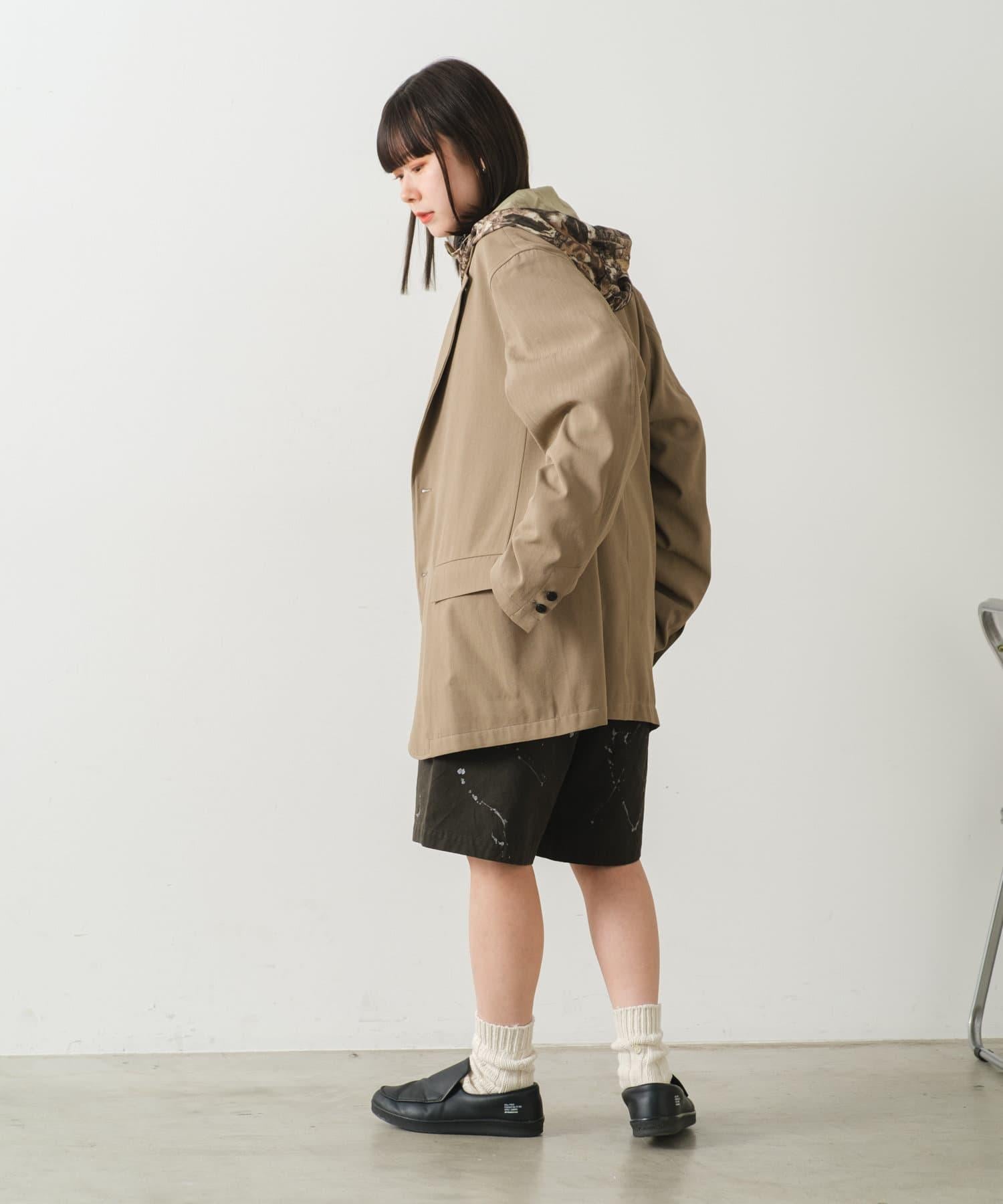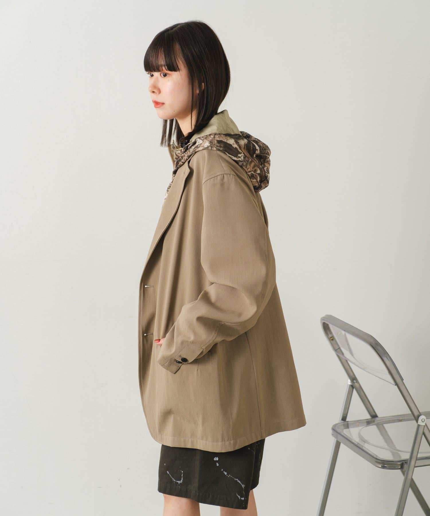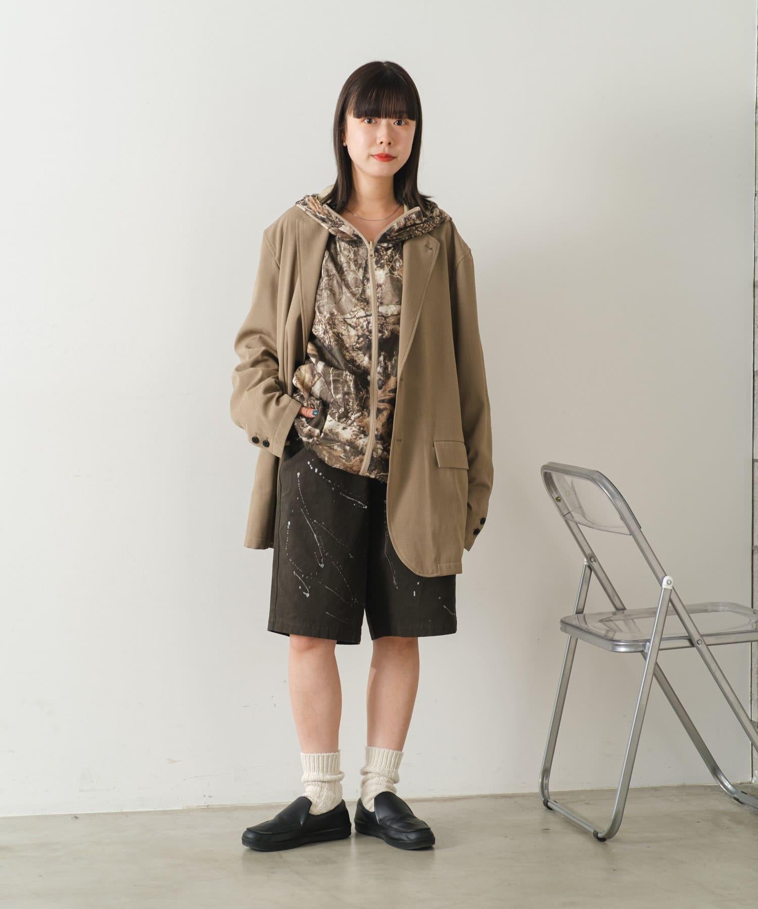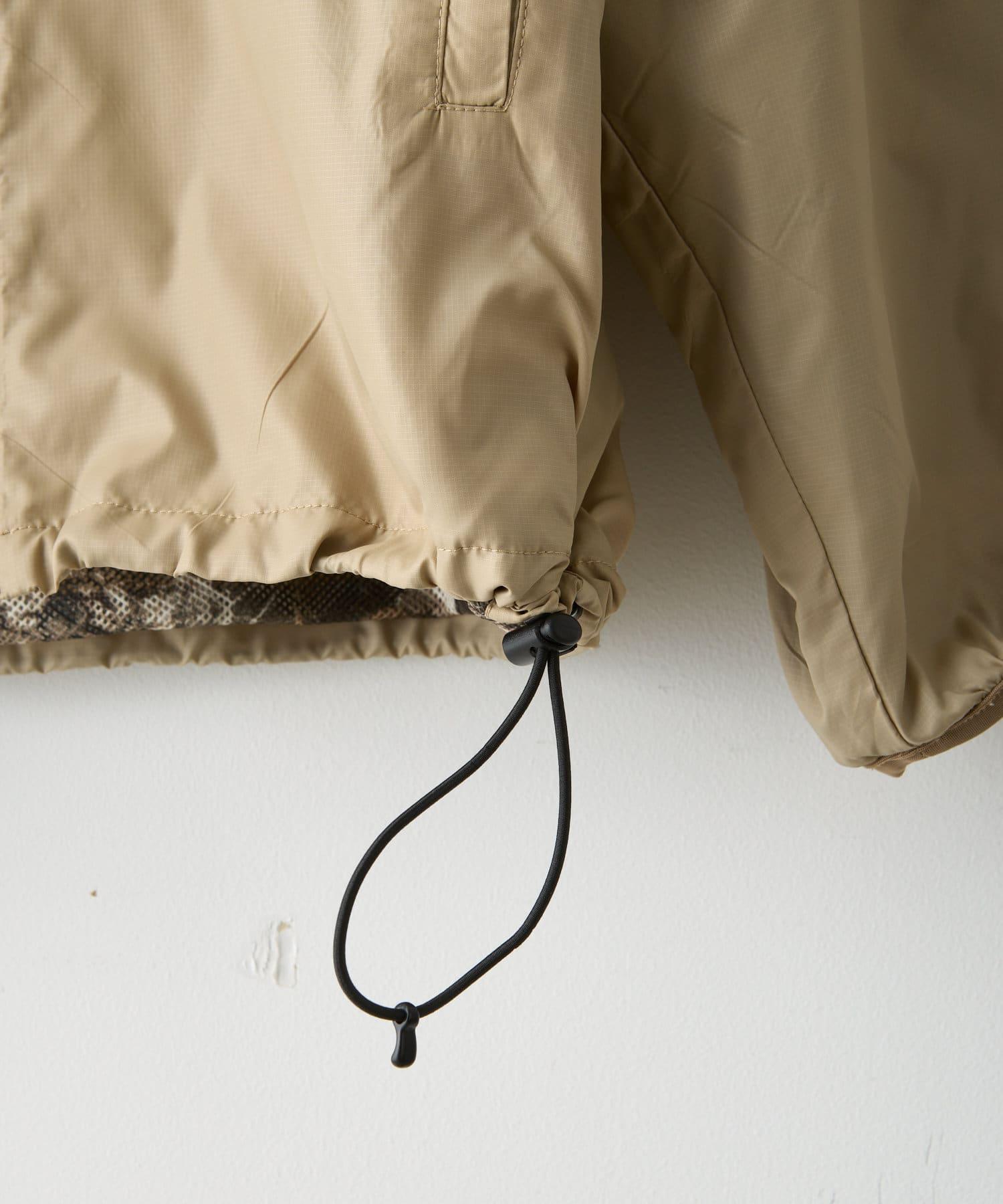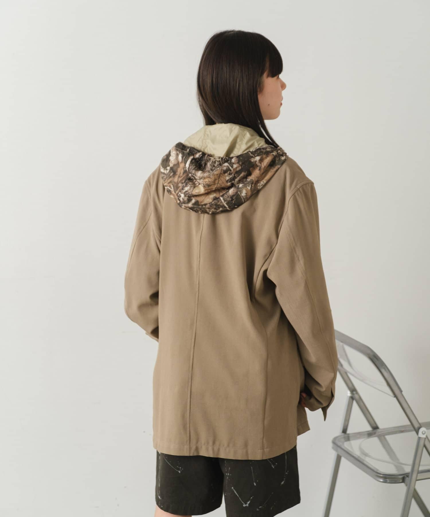 這是一款網眼/尼龍雙面拉鍊連帽衫,其配色和迷彩圖案具有 90 年代戶外和狩獵用品的感覺。