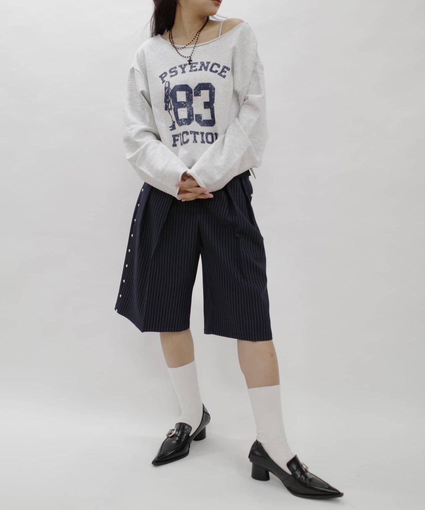 寬大的輪廓與小巧的上衣相得益彰。