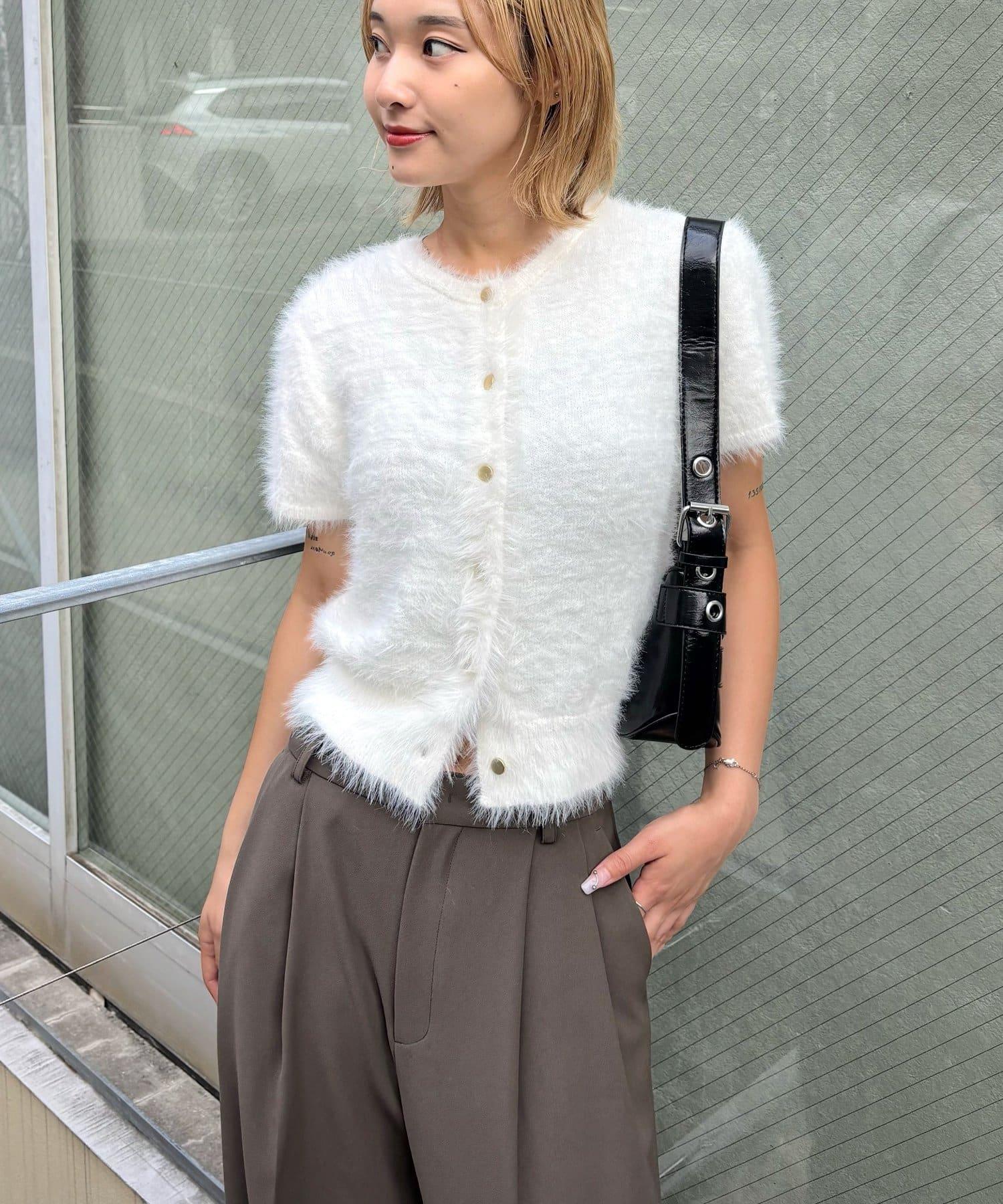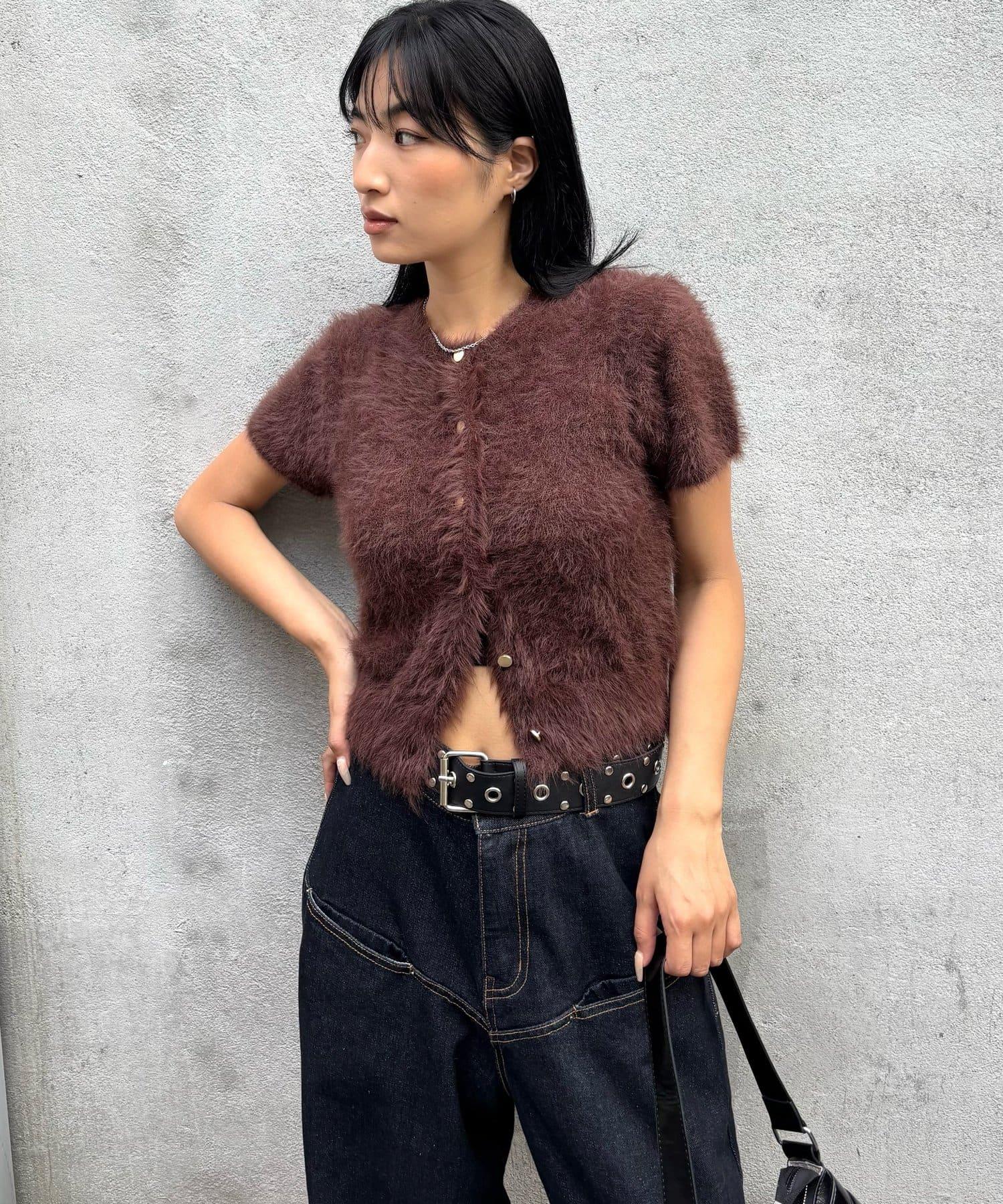 這款短袖開衫採用蓬鬆材質製成,讓人不經意間就想摸一摸。