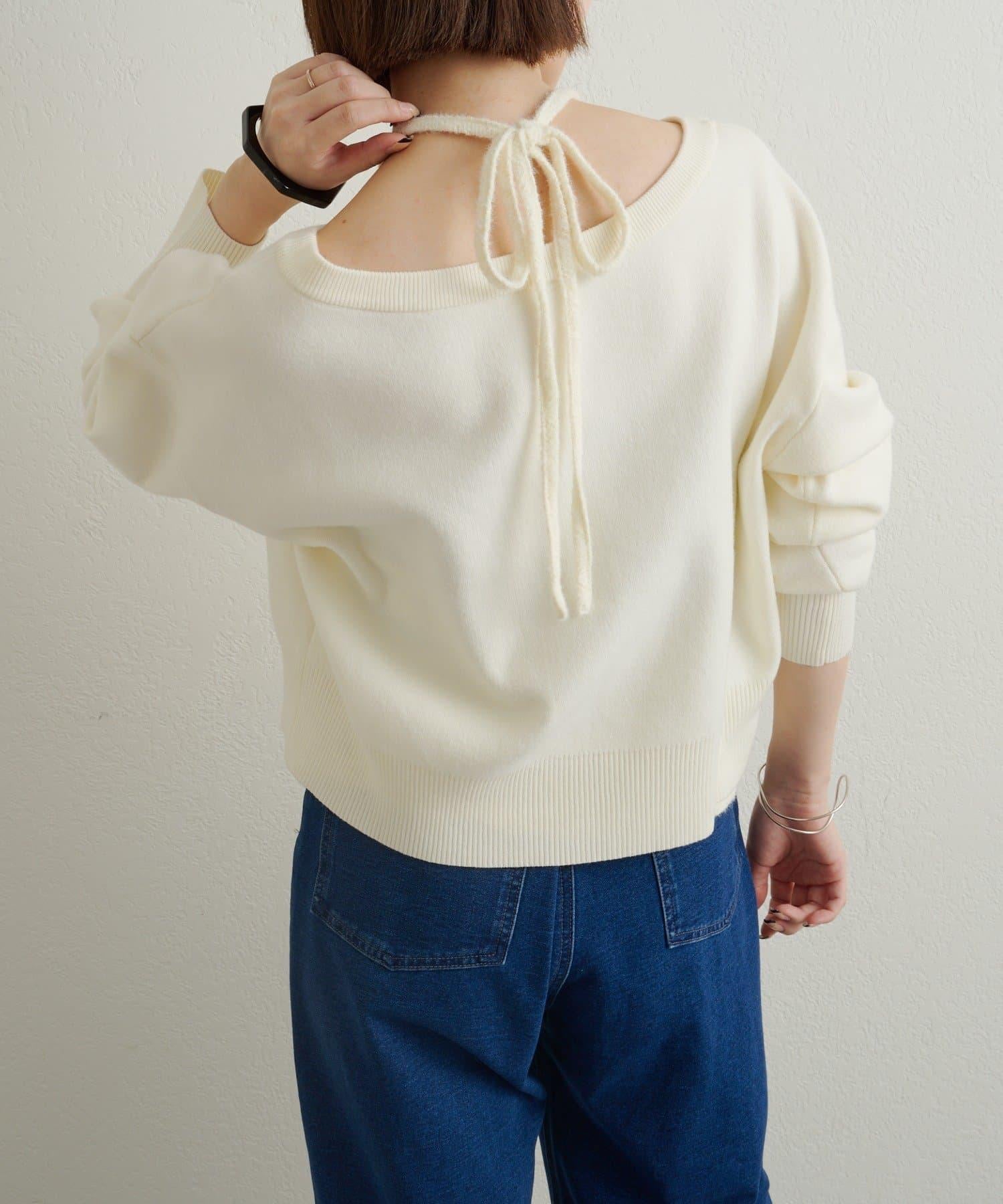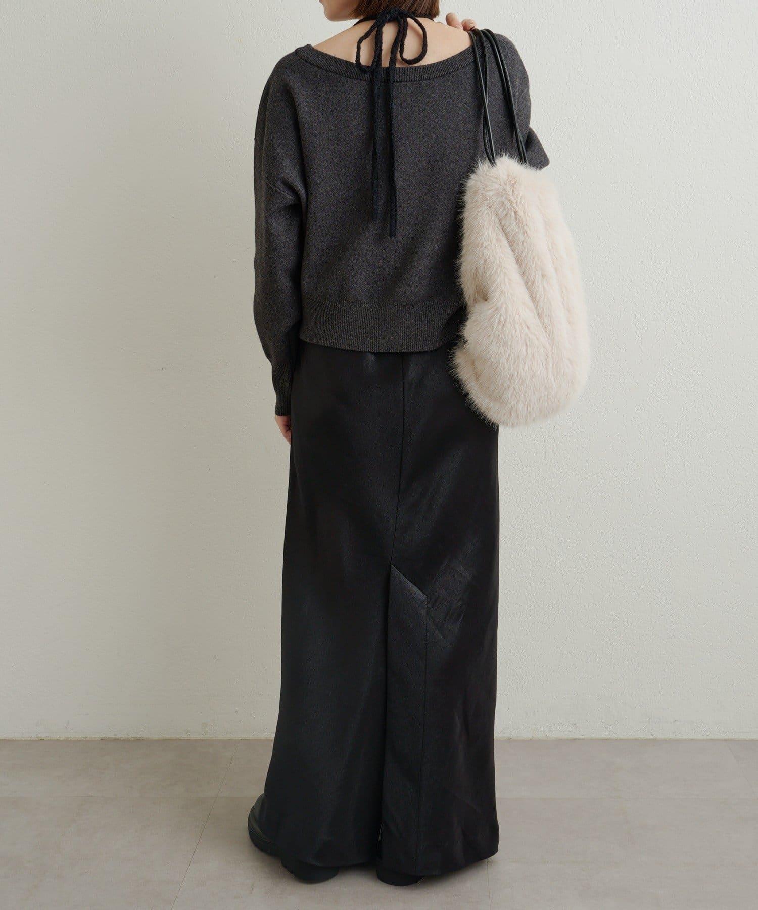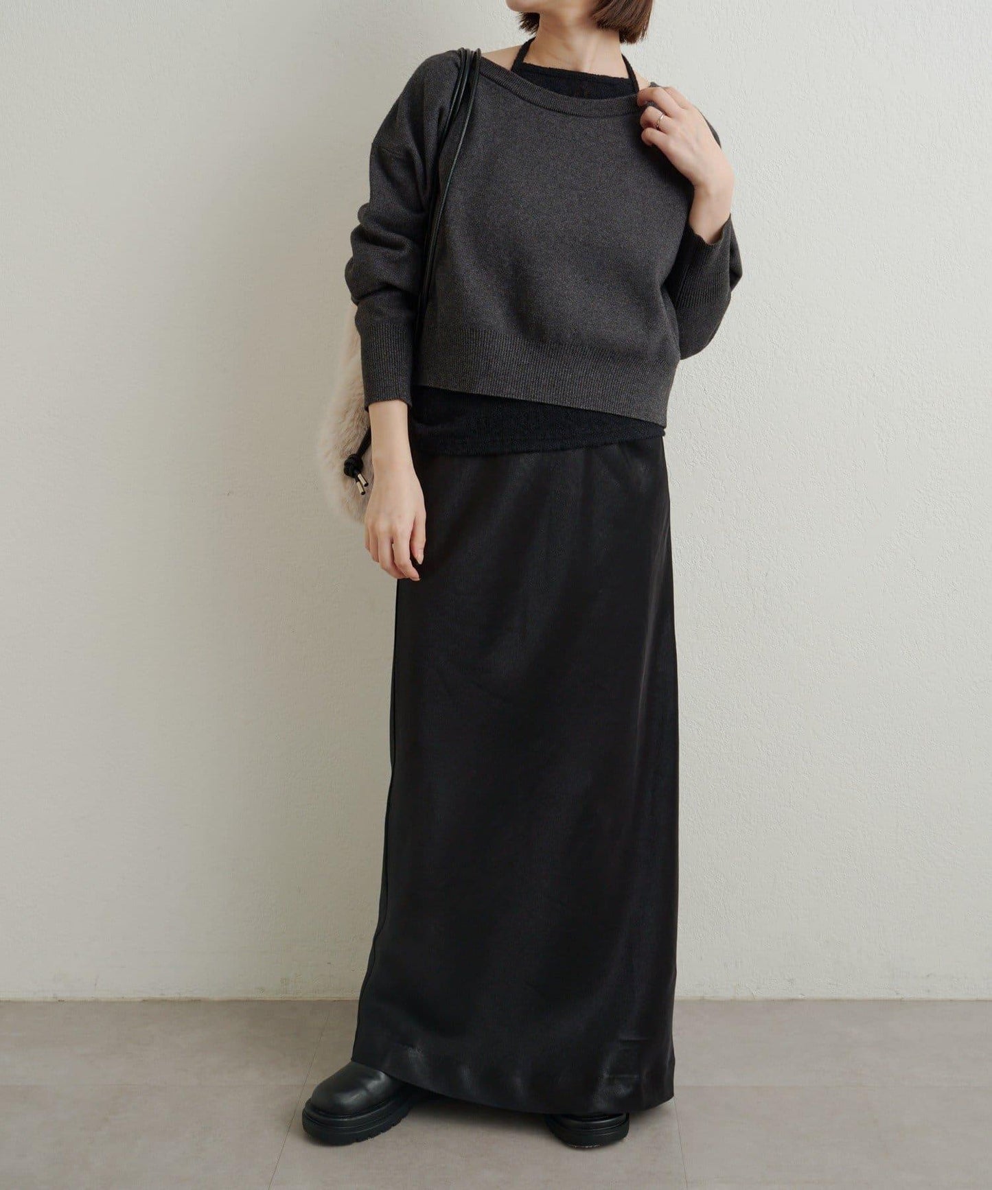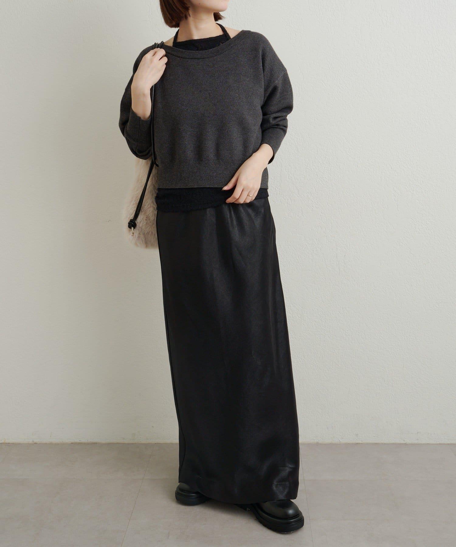 這款半身裙的頸部開口較寬,因此也可作為單肩套裝穿著。