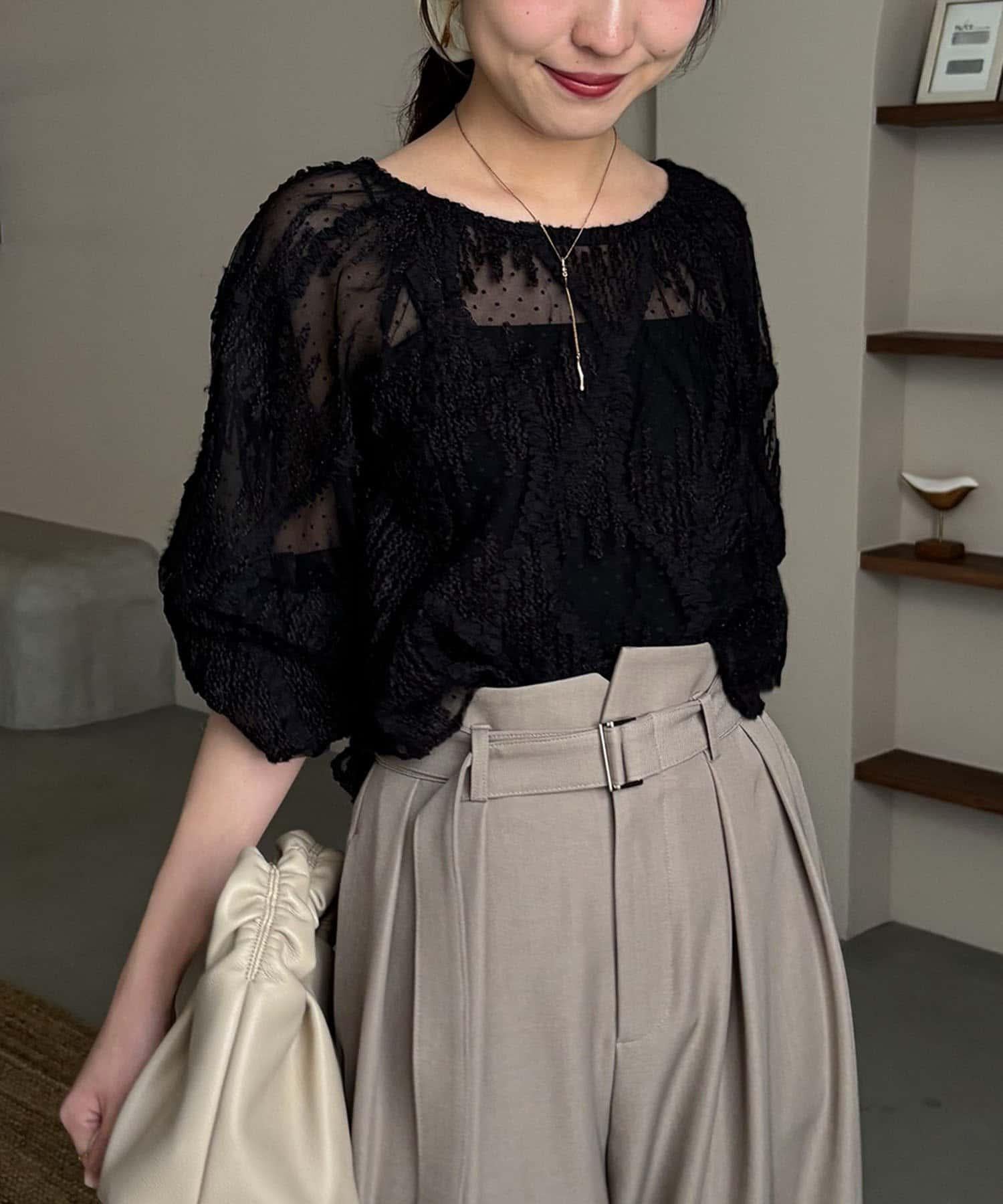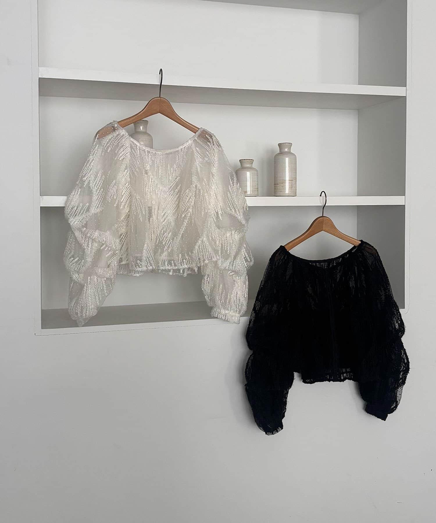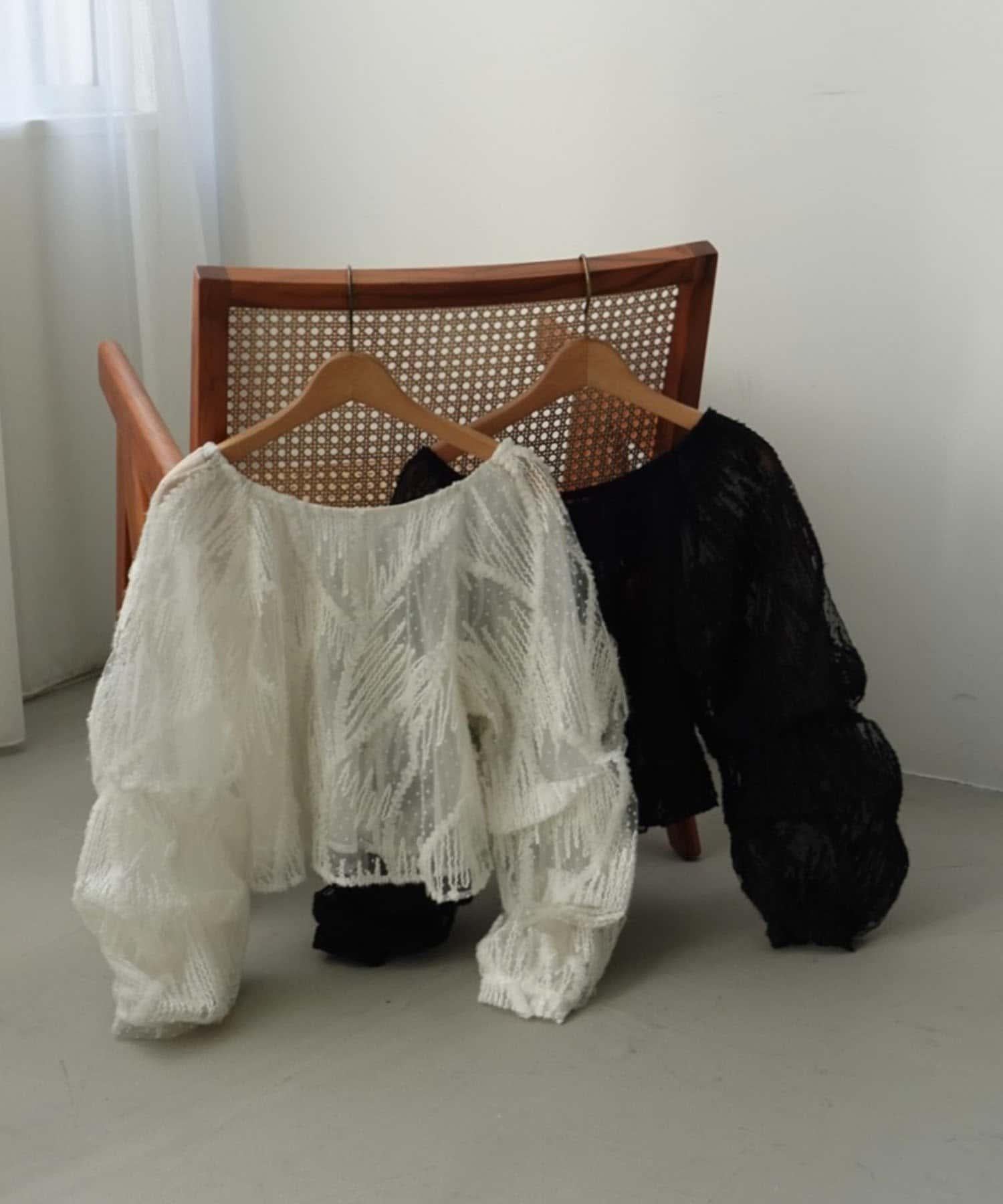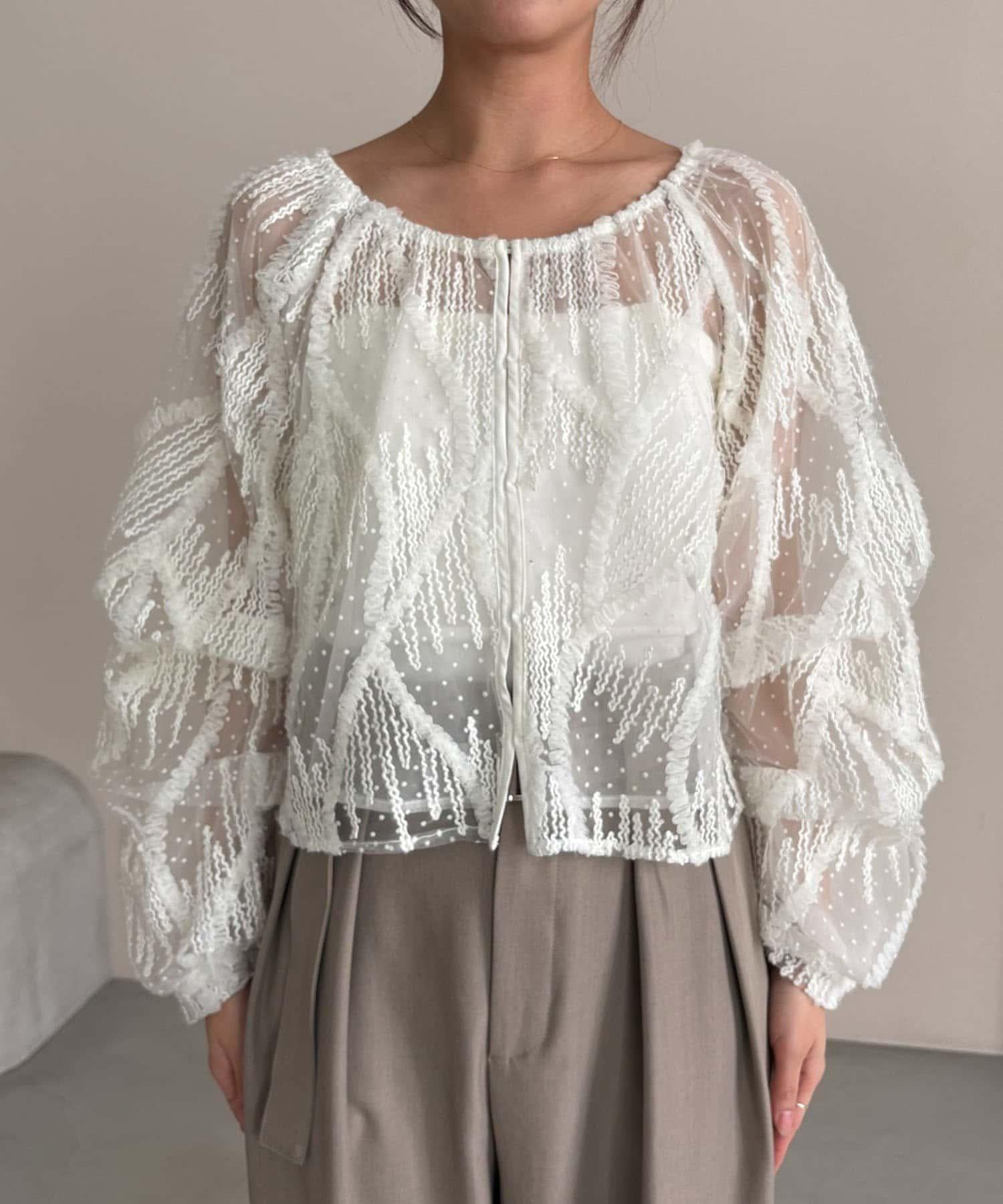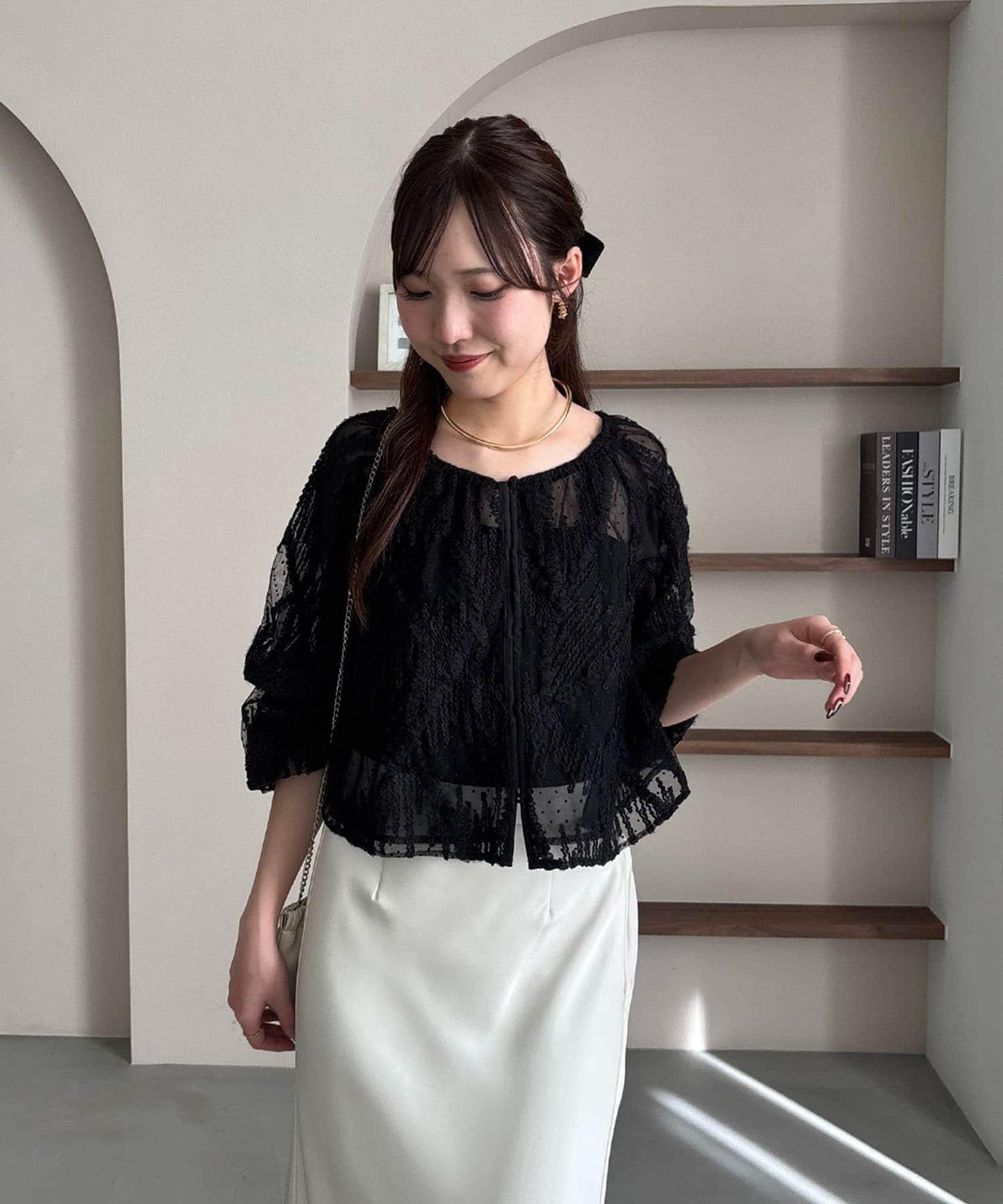 採用點線交織的精緻提花面料,是一款具有獨特表現力的上衣。