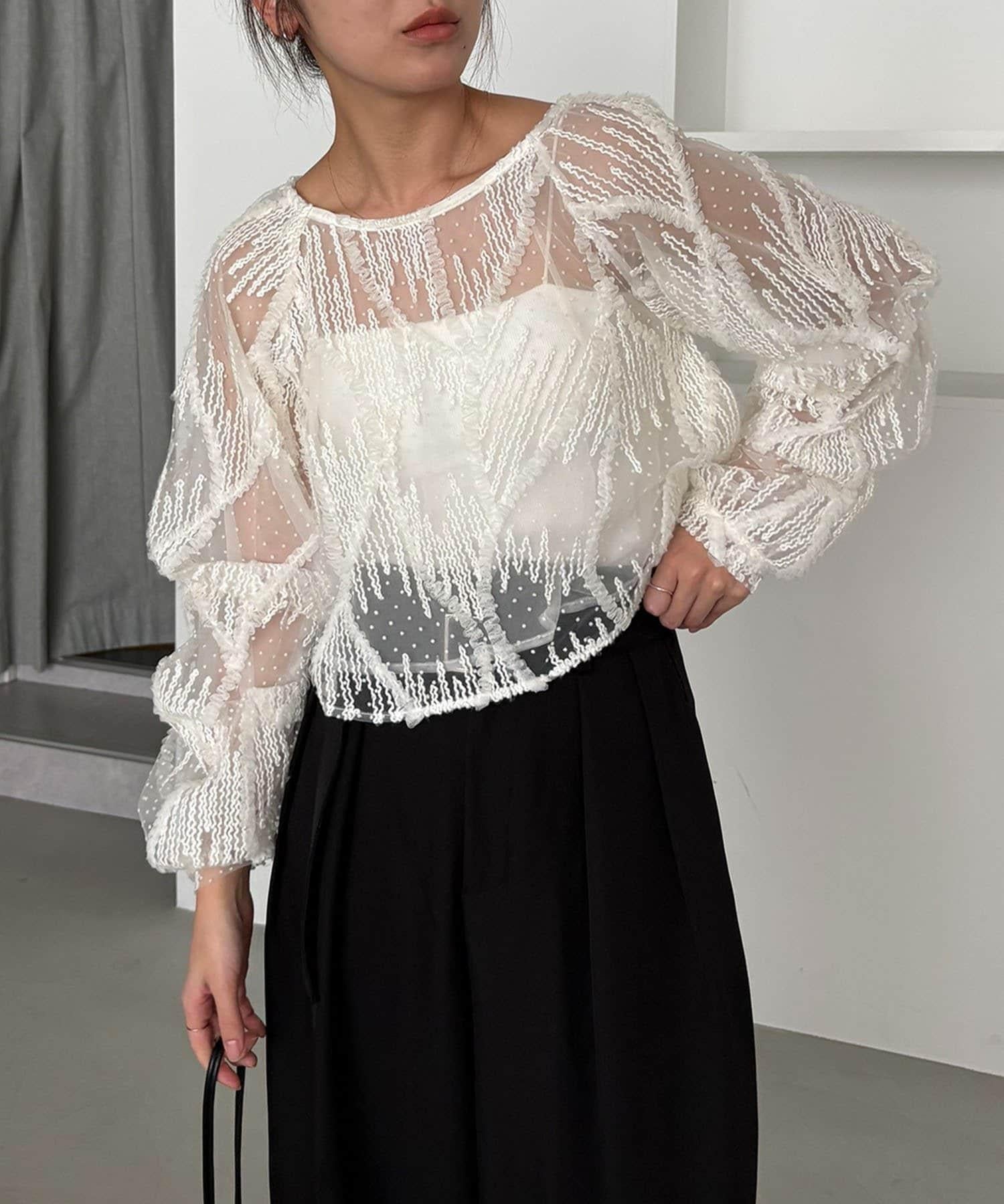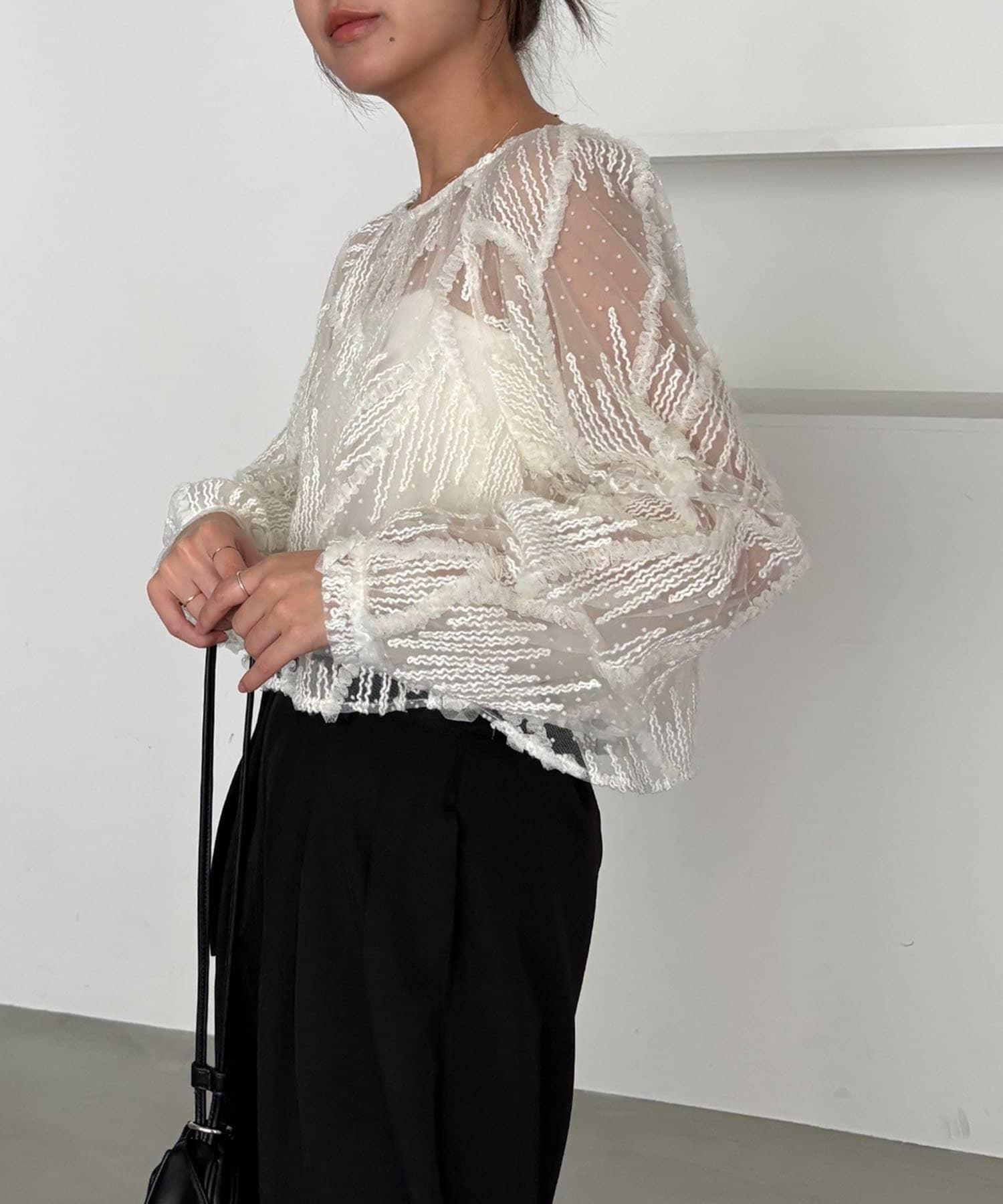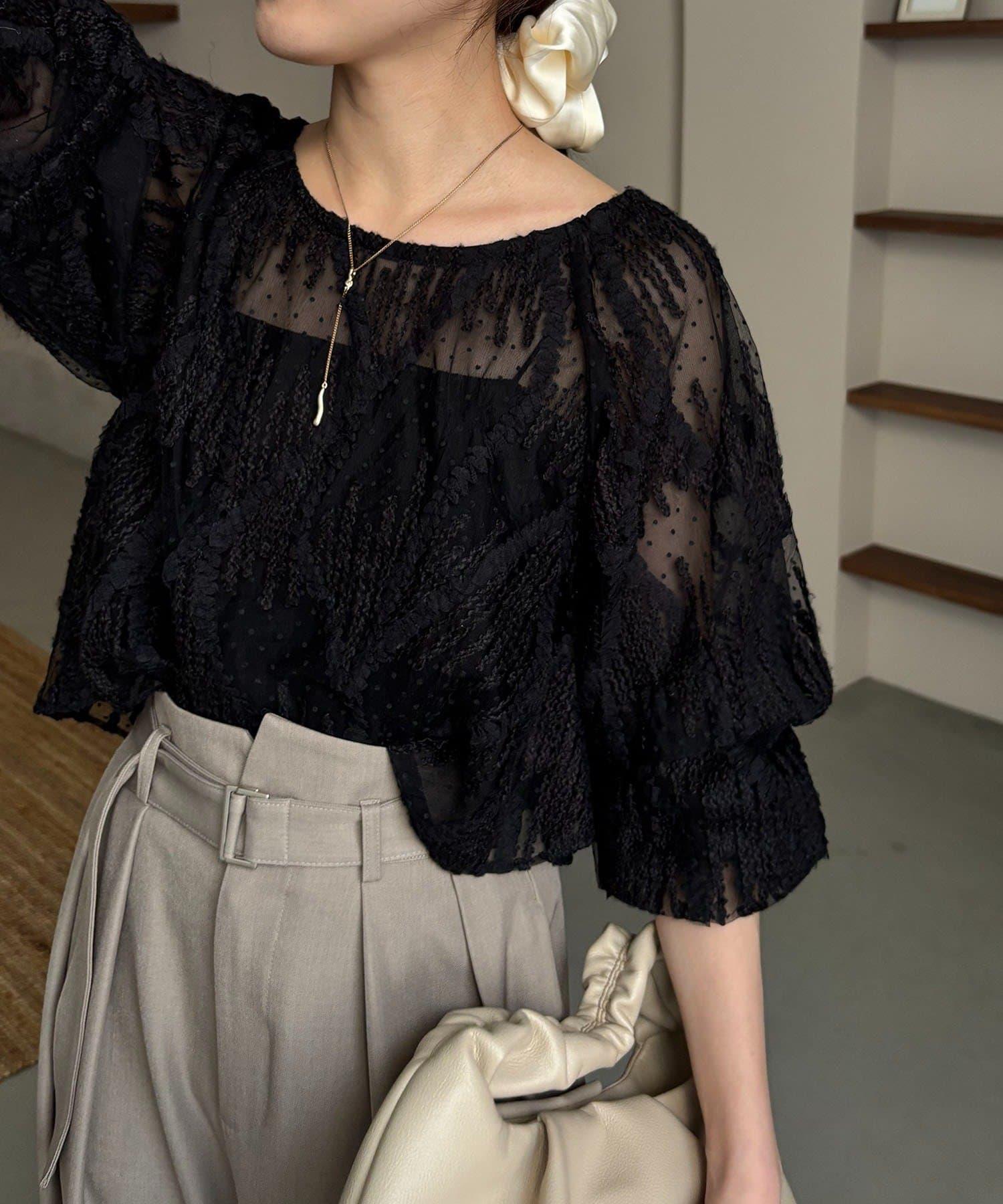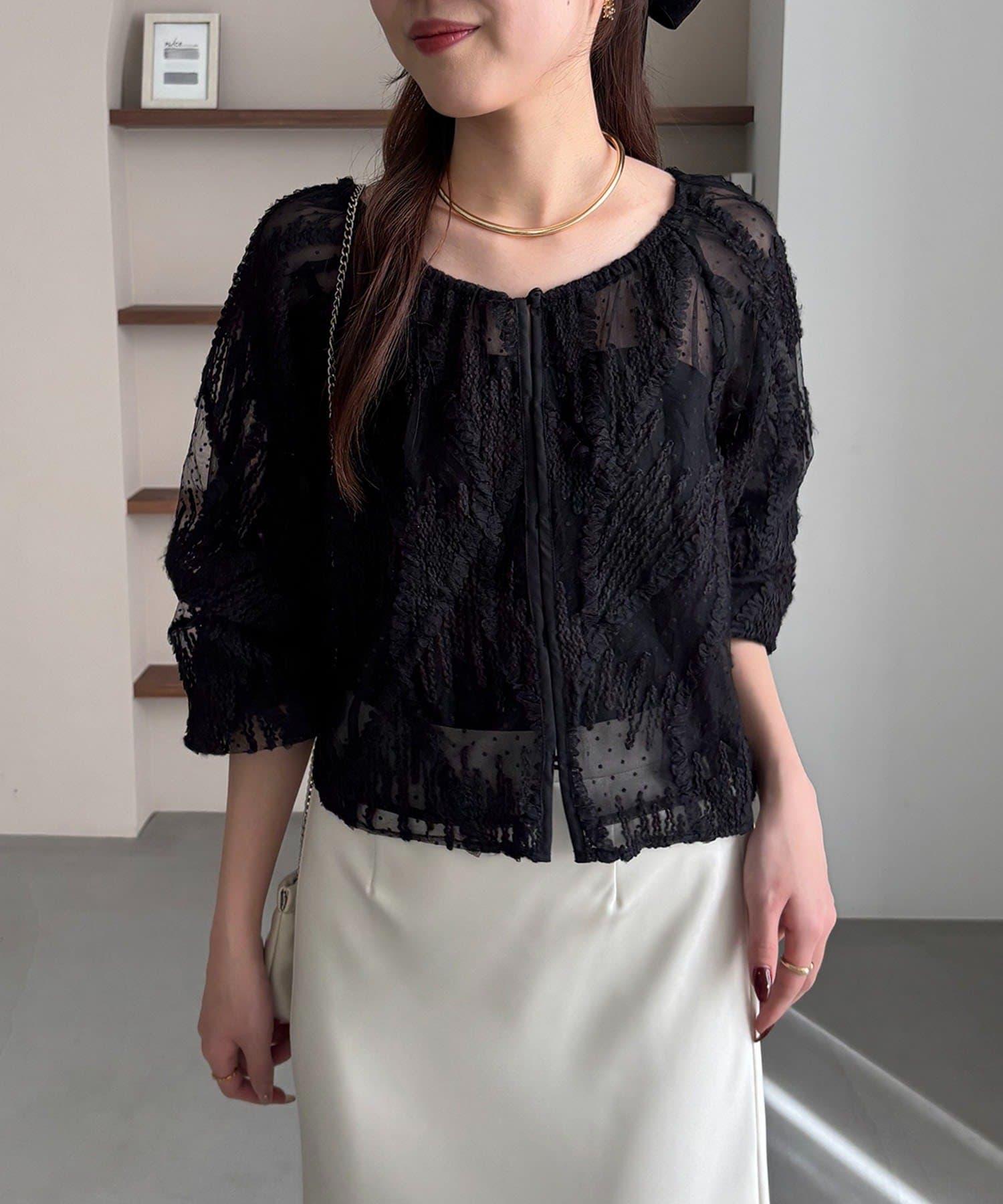 採用點線交織的精緻提花面料,是一款具有獨特表現力的上衣。