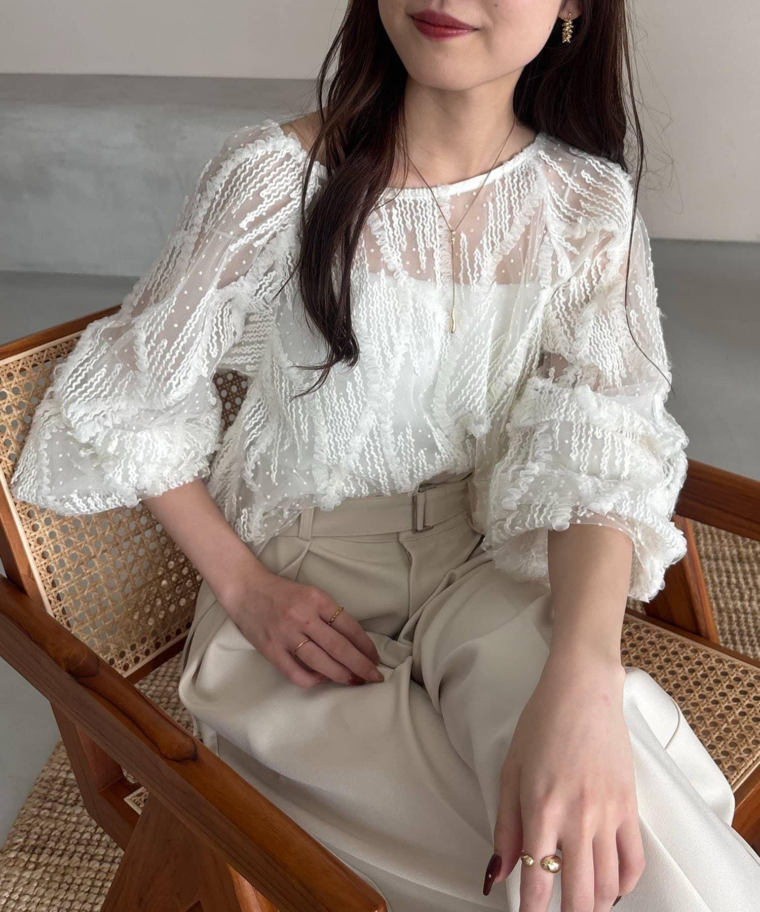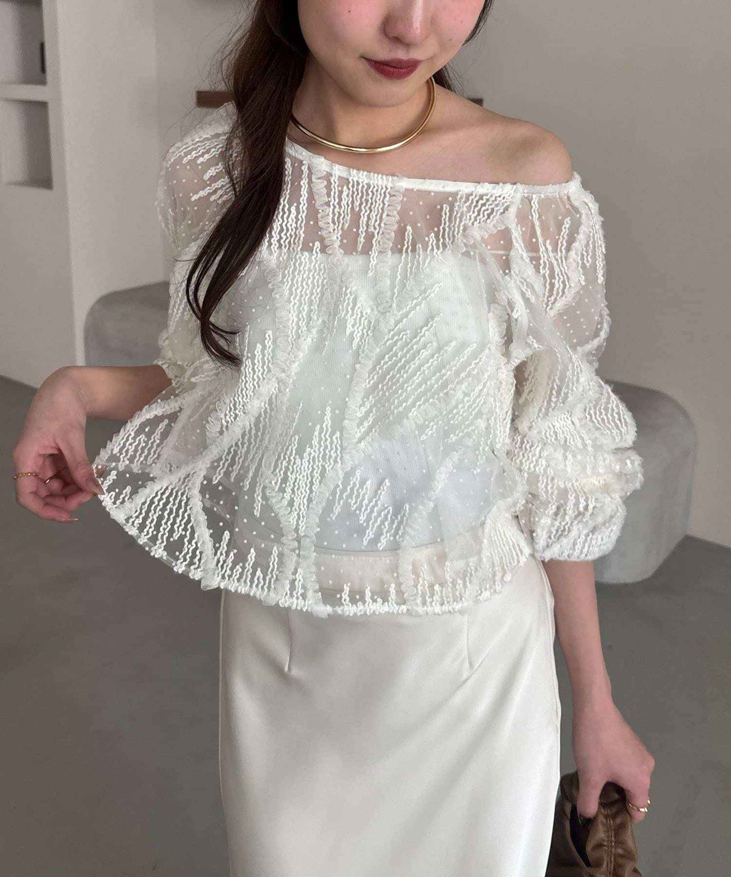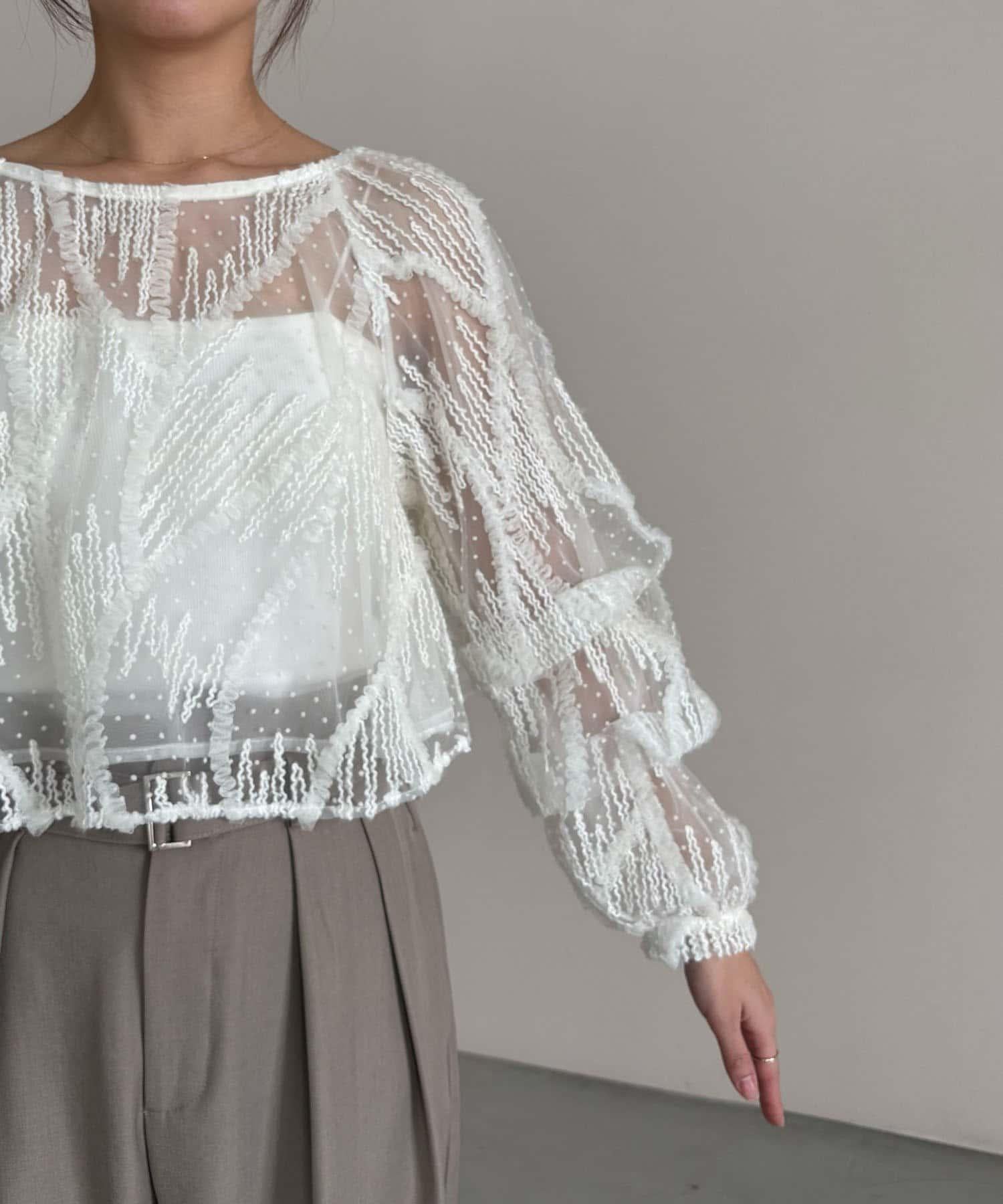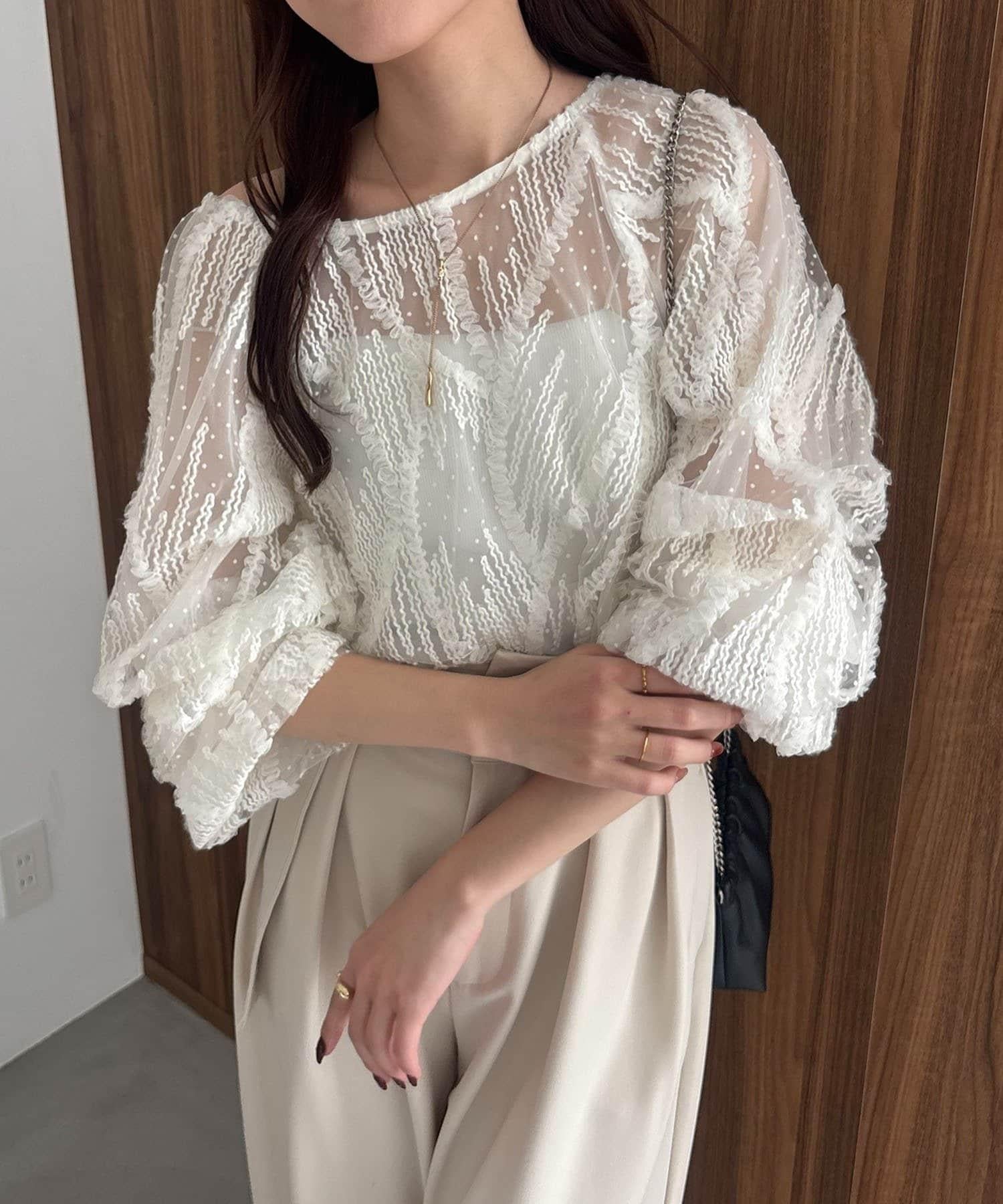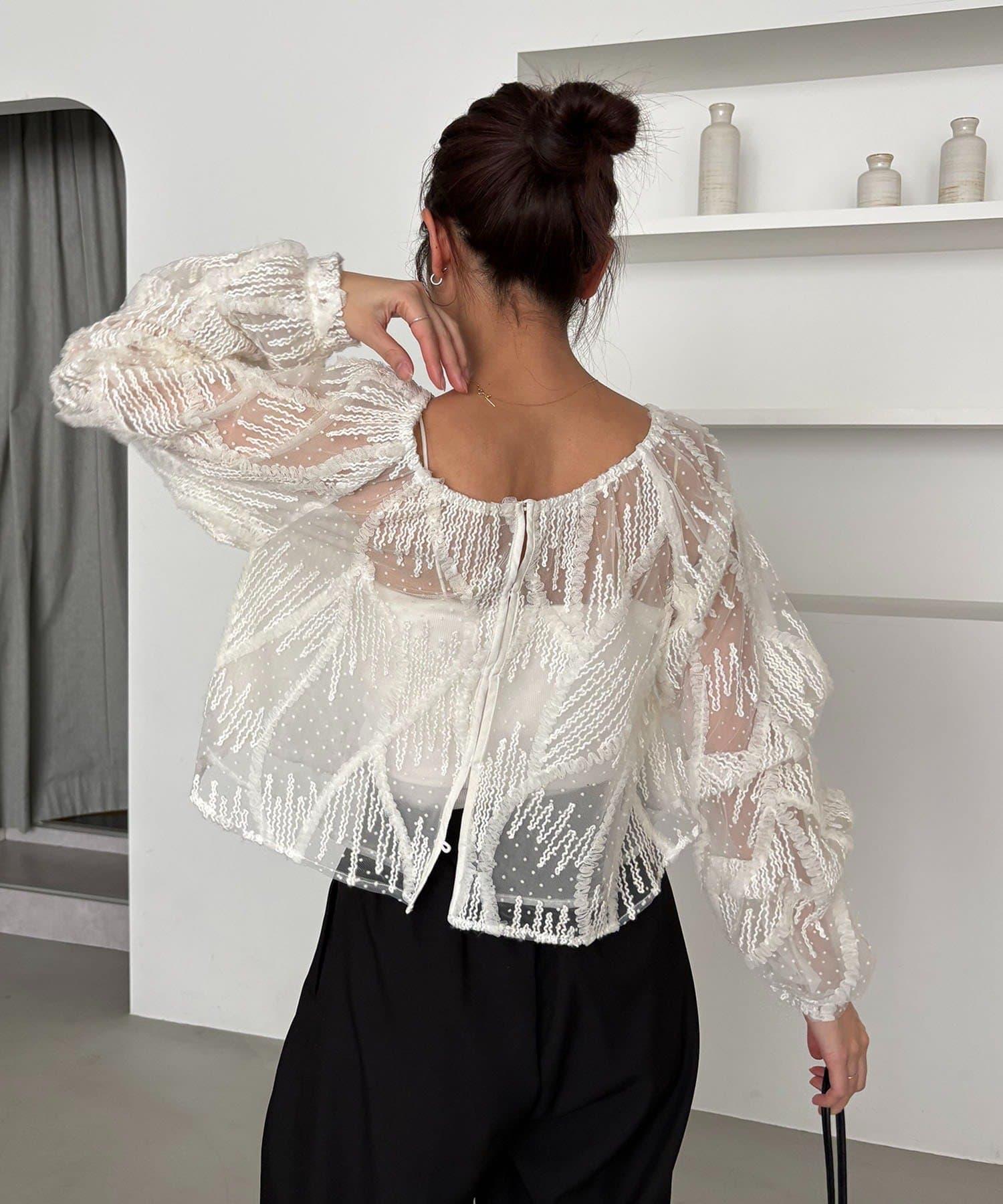 採用點線交織的精緻提花面料,是一款具有獨特表現力的上衣。